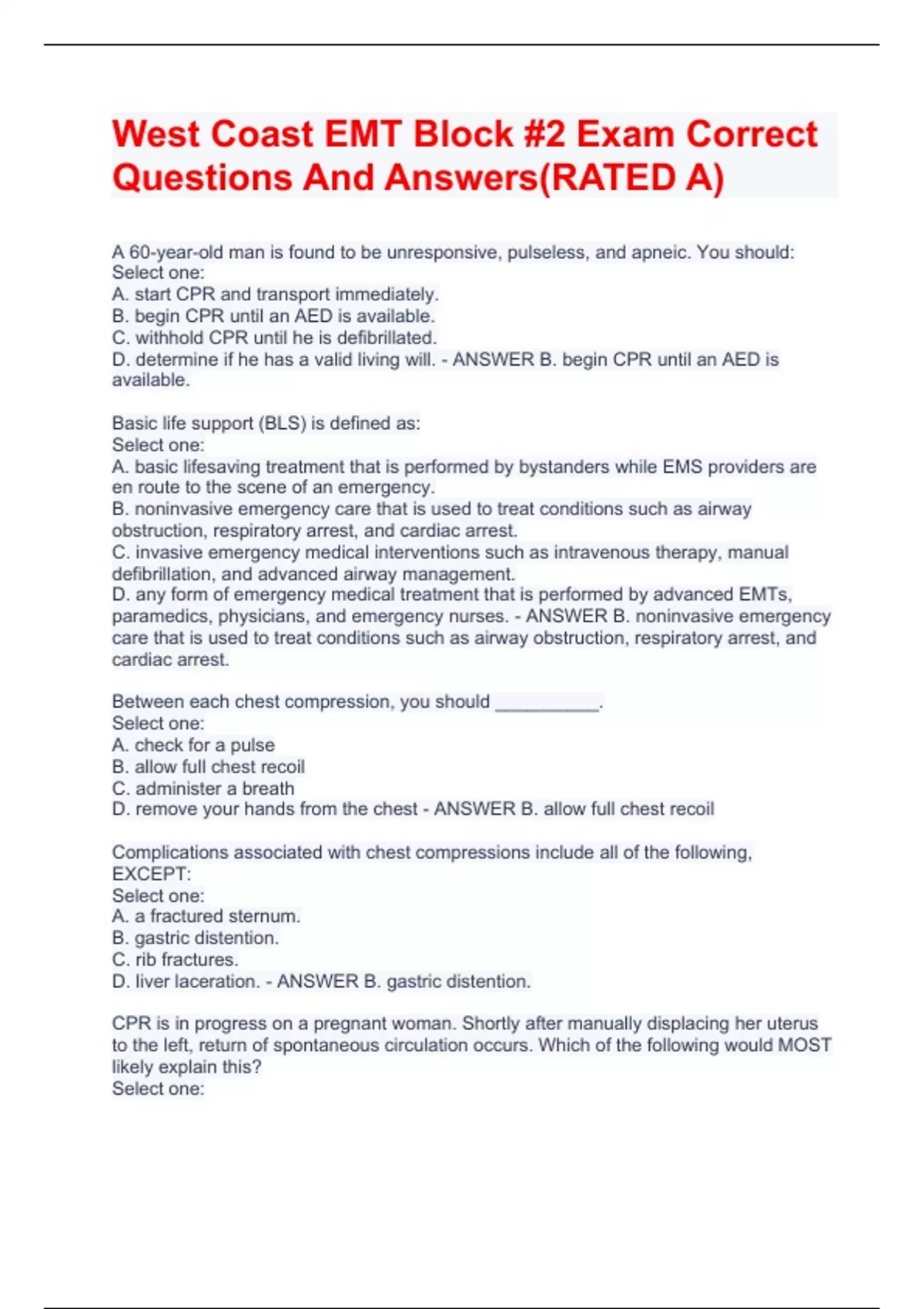 West Coast EMT Block #2 Exam Correct Questions And Answers(RATED A) A
