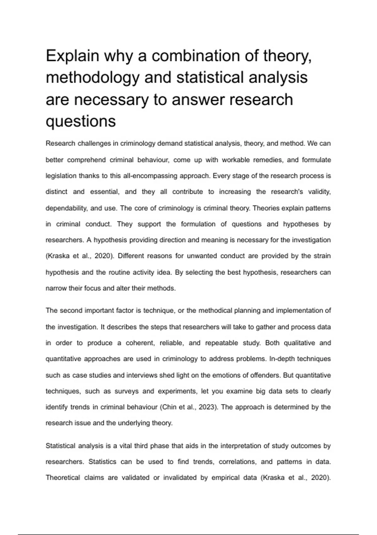 Explain why a combination of theory, methodology and statistical analysis are necessary to answer research questions. (Essay with APA Intext citation and a references list on the last page) A+ graded 100% Verified) Learn how to write a good essay with me.