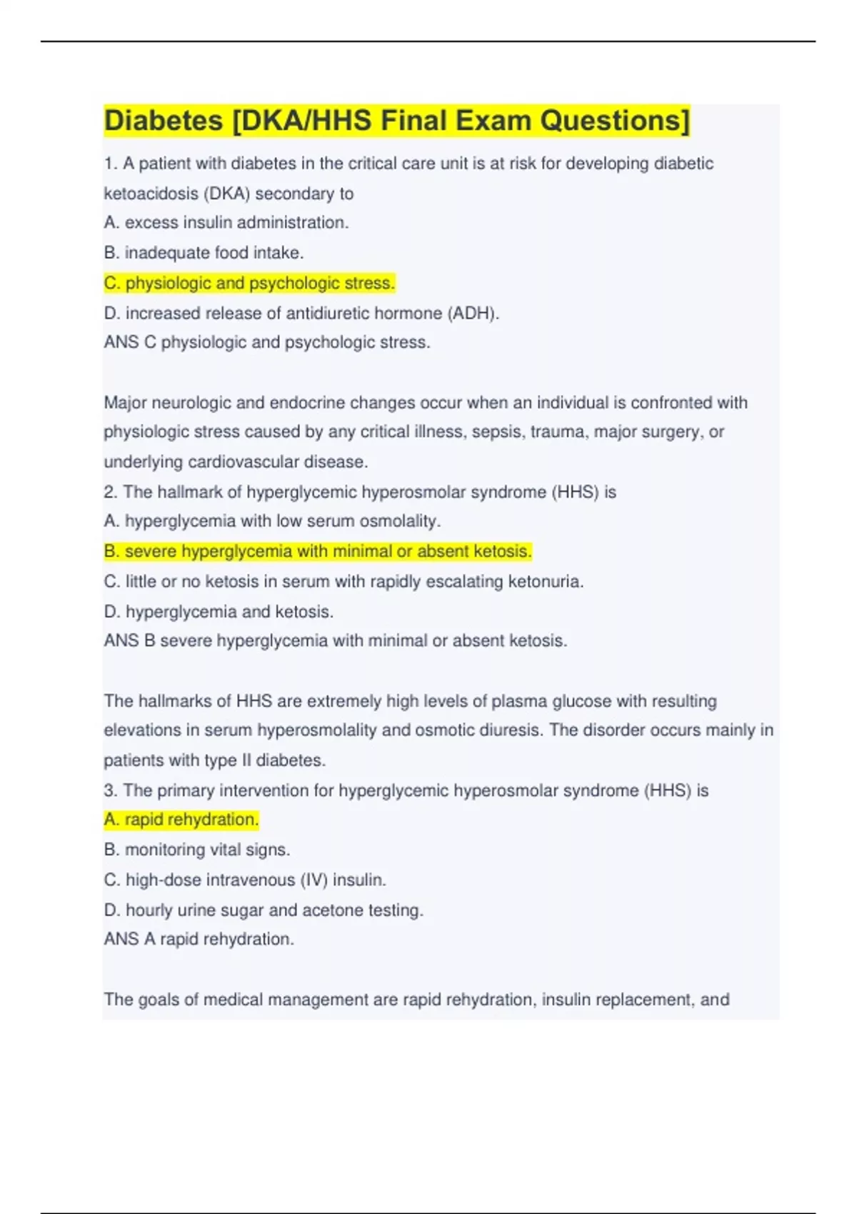 Diabetes [DKA/HHS Final Exam Questions] A+ Rated