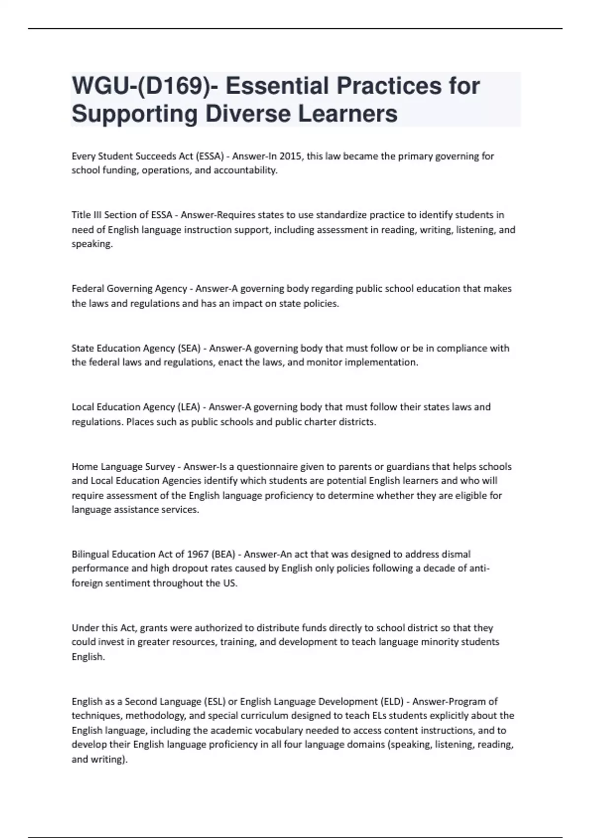WGU-(D169)- Essential Practices for Supporting Diverse Learners Questions With 100% Correct Answers.