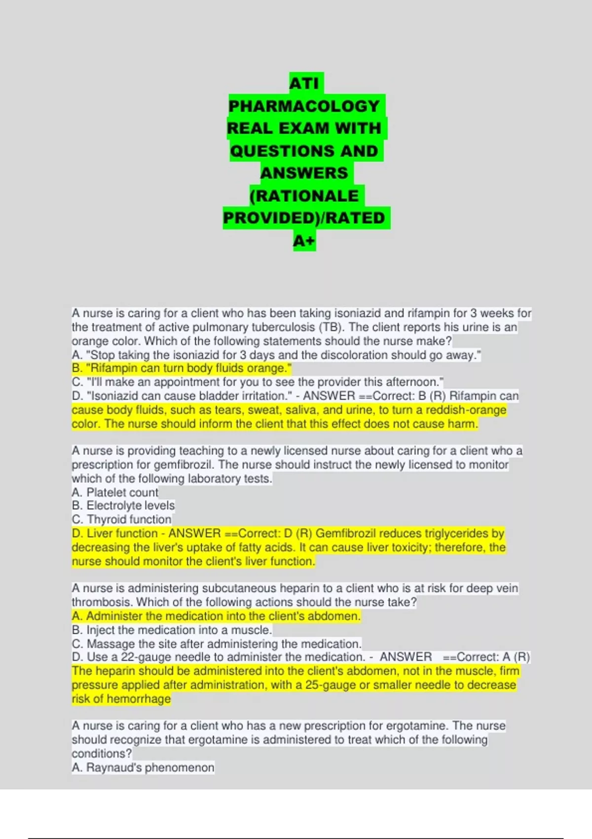 A PACKAGE DEAL FOR ATI PHARMACOLOGYWELL ORGANISED EXAM QUESTIONS AND CORRECT ANSWERS/DOWNLOAD SCORE A
