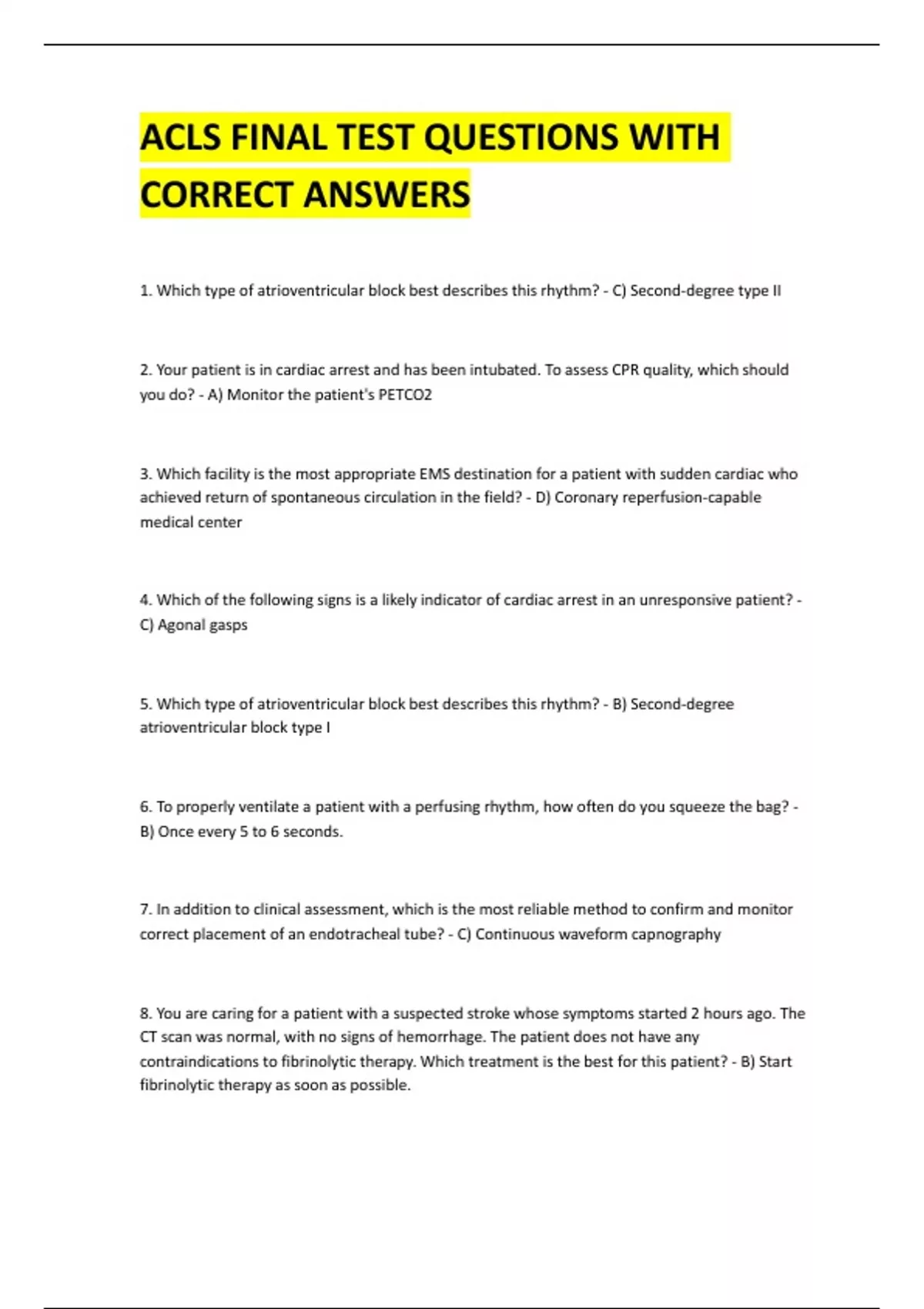 ACLS: FINAL TEST QUESTIONS AND ANSWERS 2024 ACLS 2024 certification part 1 & 2 review ACLS PreTest: Pharmacology and Practical Application Questions With Correct Answers
