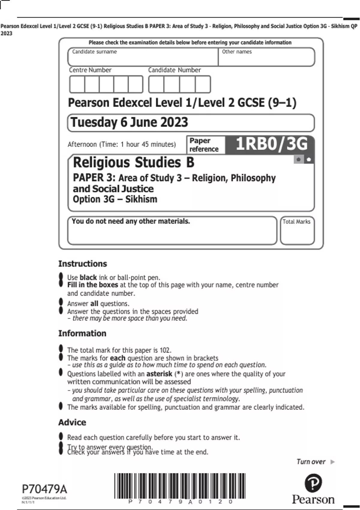 Pearson Edexcel Level 1/Level 2 GCSE (9–1) Religious Studies B PAPER 3: Area of Study 3 – Religion, Philosophy and Social Justice Option 3G – Sikhism QP 2023