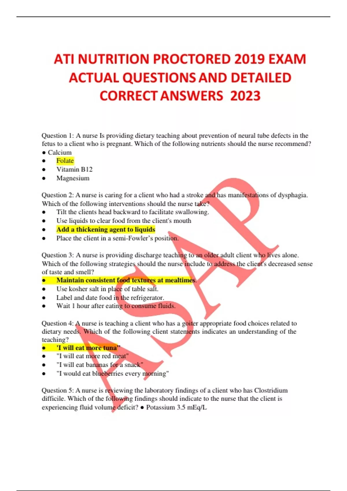 ATI NUTRITION PROCTORED 2019 EXAM ACTUAL QUESTIONSAND DETAILED CORRECT ANSWERS 2023