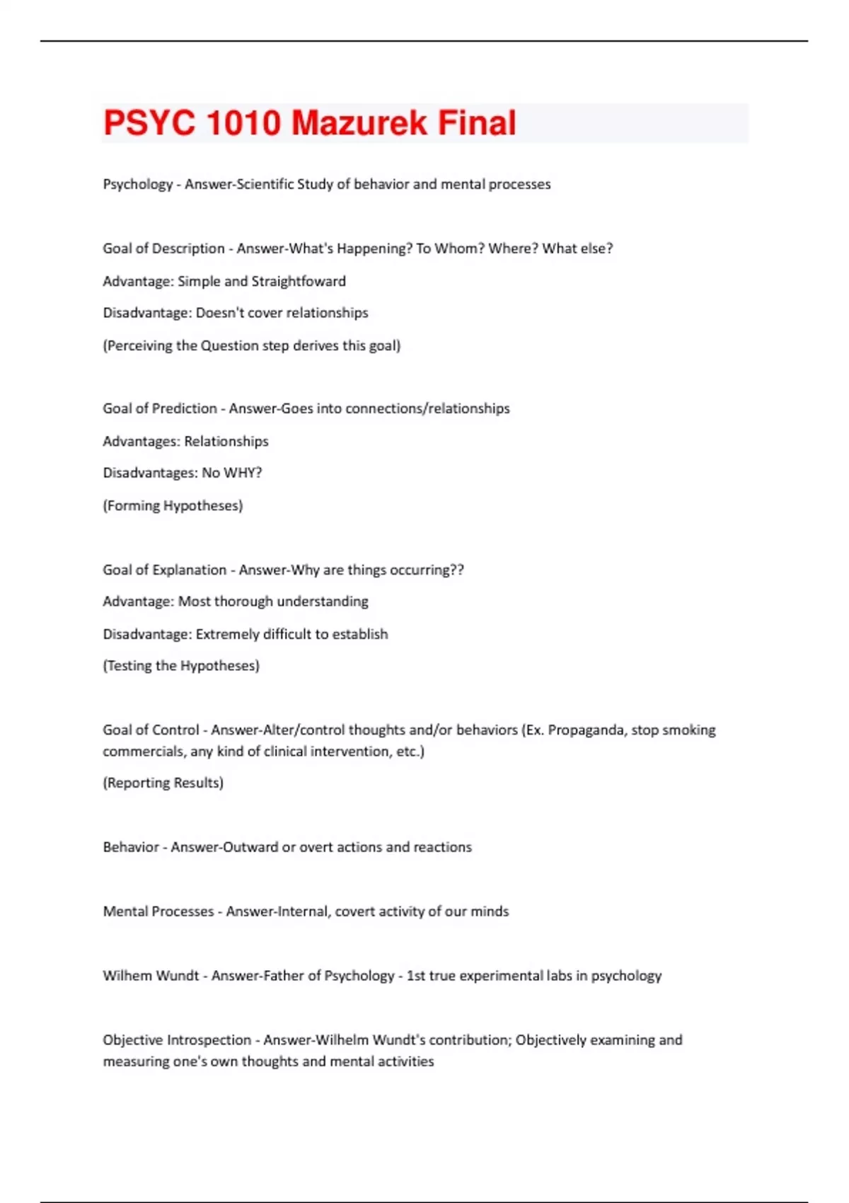 PSYC 1010 Mazurek Final Questions and Answers with complete