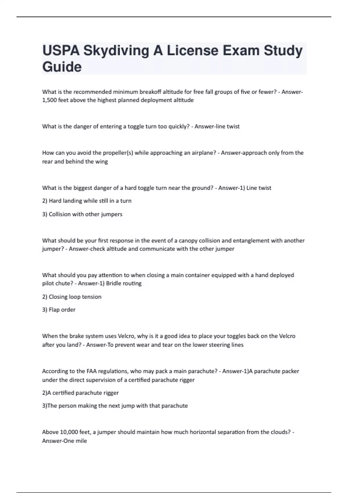 USPA Skydiving A License Exam Study Guide Graded A+