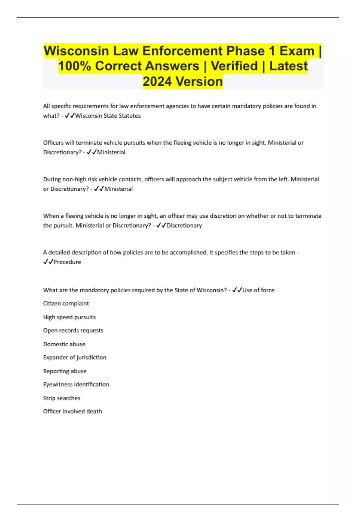 Wisconsin Law Enforcement Phase 1 Exam | 100% Correct Answers | Verified | Latest 2024 Version