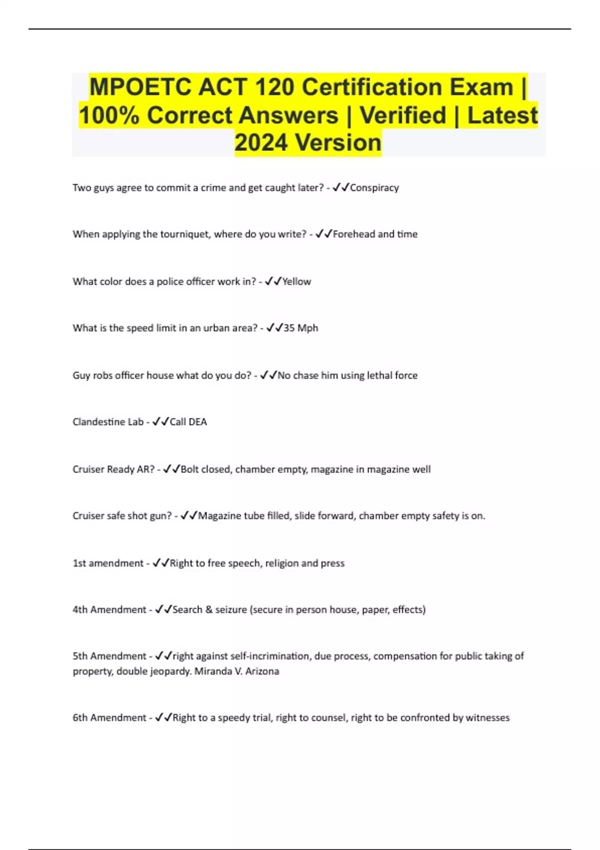 MPOETC ACT 120 Certification Exam | 100% Correct Answers | Verified | Latest 2024 Version