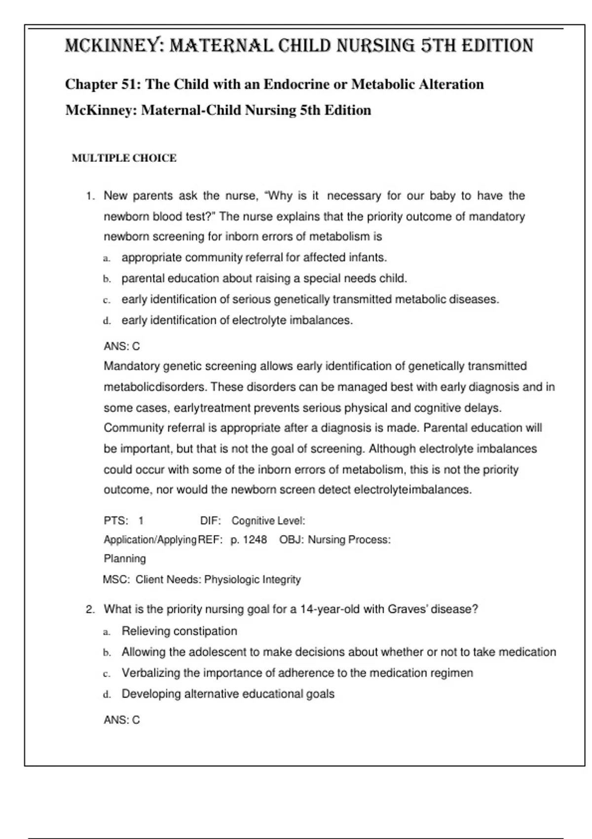 Maternal Child Nursing 5th Edition by McKinney- ISBN- 978-0323401708 TEST BANK Chapter 51: The Child with an Endocrine or Metabolic Alteration Verified 2024 Practice Questions and 100% Correct Answers with Explanations for Exam Preparation, Graded A+