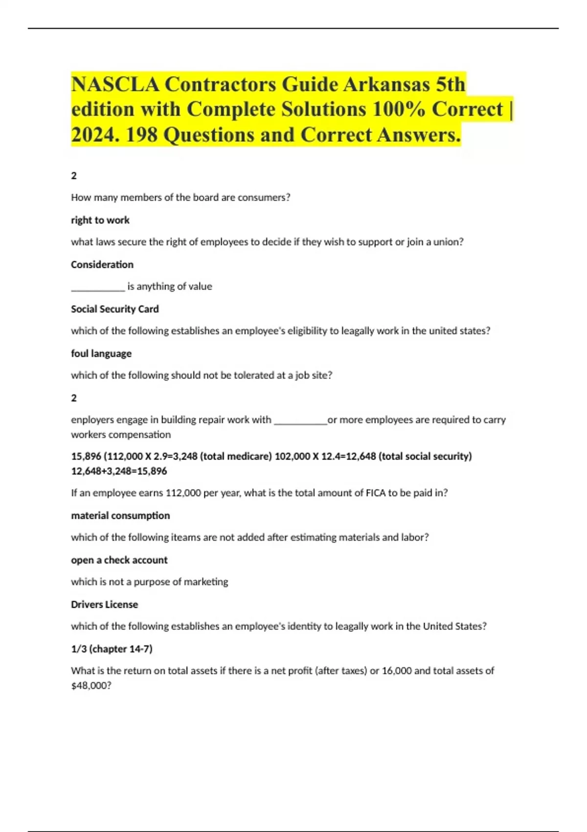 NASCLA Contractors Guide Arkansas 5th edition with Complete Solutions 100% Correct | 2024. 198 Questions and Correct Answers ARKANSAS HEALTH INSURANCE EXAM WITH 100% CORRECT ANSWERS 2024. Insurance Licensing - Chapter 15: Arkansas State Law Exam Questions And Correct Answers 2024. Arkansas Life Insurance Exam. 242 Questions With 100% Correct Answer