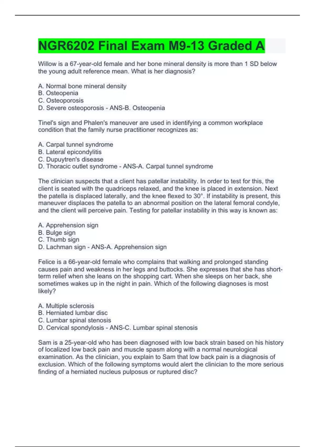 1 Exam (elaborations) NGR6202 Final Exam M9-13 Graded A 2 Exam (elaborations) NGR6200 Quizzes with Complete Solutions 3 Exam (elaborations) NGR6200 Quizzes (Foundation, HEENT). 4 Exam (elaborations) NGR6200 Exam 2 with Complete Solutions 5 Exam (elaborations) NGR6200 Dermatology Exam Graded A+ 6 Exam (elaborations) NGR6200 CV Quiz (Verified 10