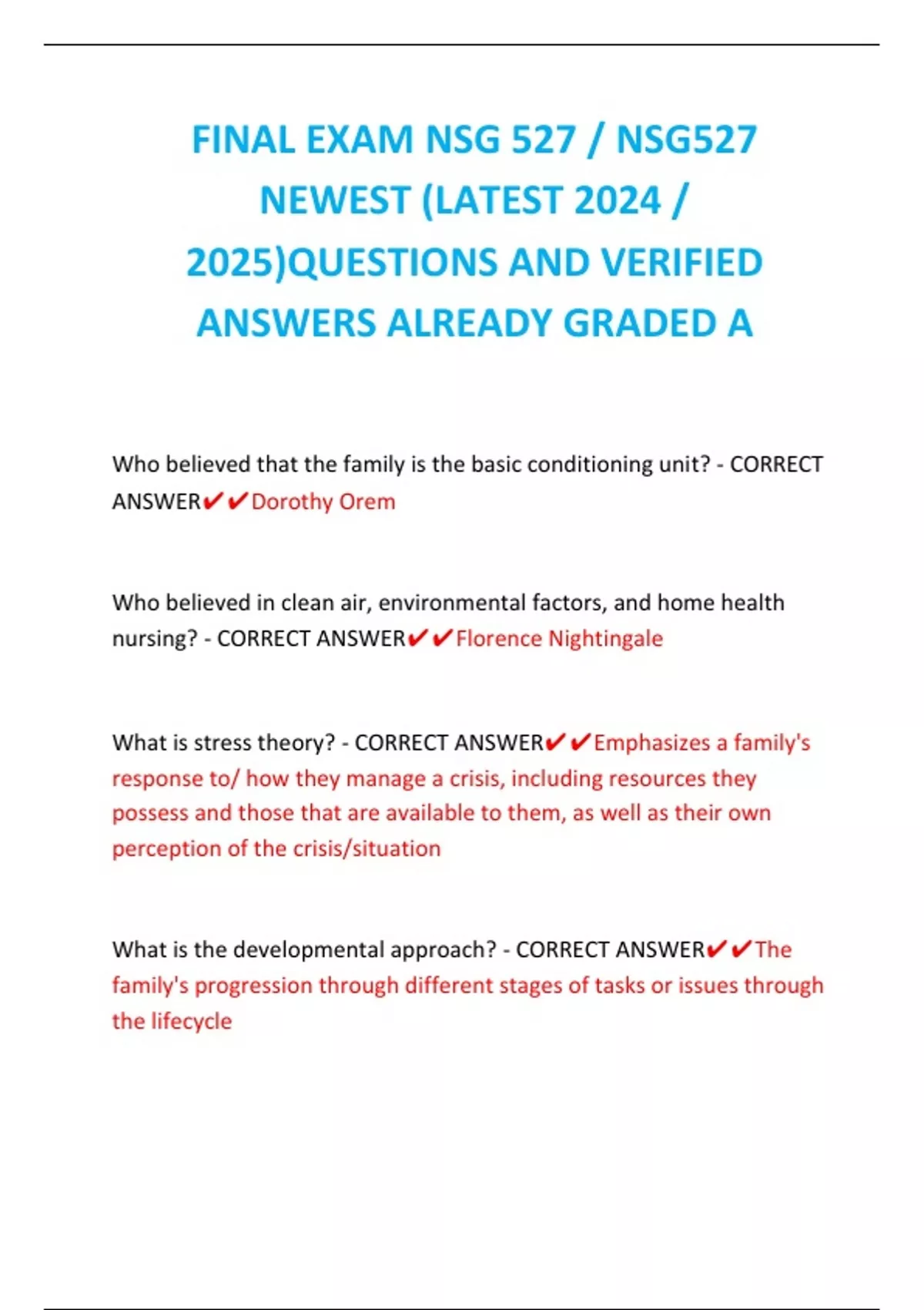 NSG 527/ NSG 527 FINAL NEWEST UPDATED EXAM | 51 QUESTIONS AND CORRECT VERIFIED ANSWERS GRADED A 2 Exam (elaborations) MIDTERM EXAM REVIEW: NSG 527 / NSG 527 |110+ QUESTIONS AND VERIFIED ANSWERS GRADED A+ LATEST UPDATE 2024 3 Exam (elaborations) FINAL EXAM NSG 527 / NSG527 NEWEST (LATEST 2024 / 2025)QUESTIONS AND VERIFIED ANSWERS ALREADY