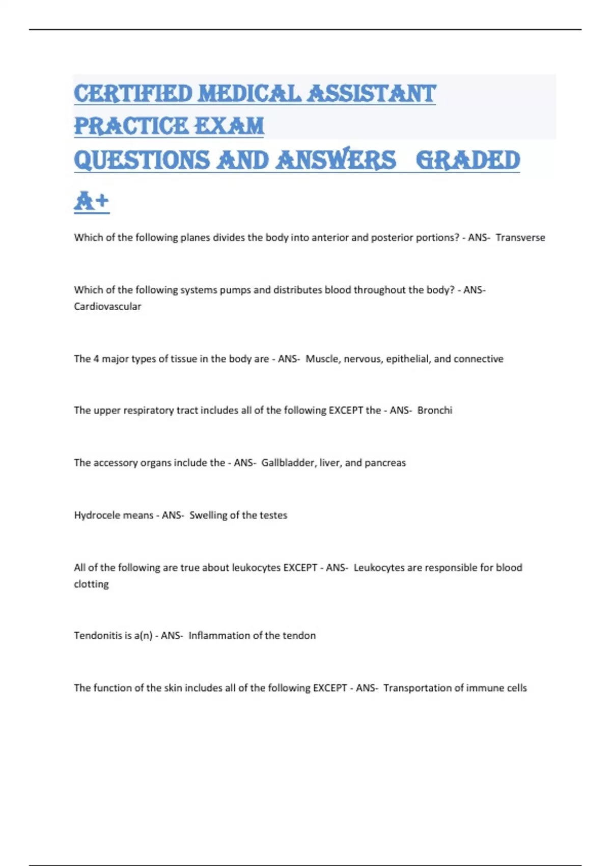 Unlock the secrets to becoming a Certified Medical Assistant with this essential Package of verified Questions and Answers approved by tutors. With practical tips, comprehensive study materials, and selection , it's your roadmap to success in passing the Medical Assistant Certification exam.