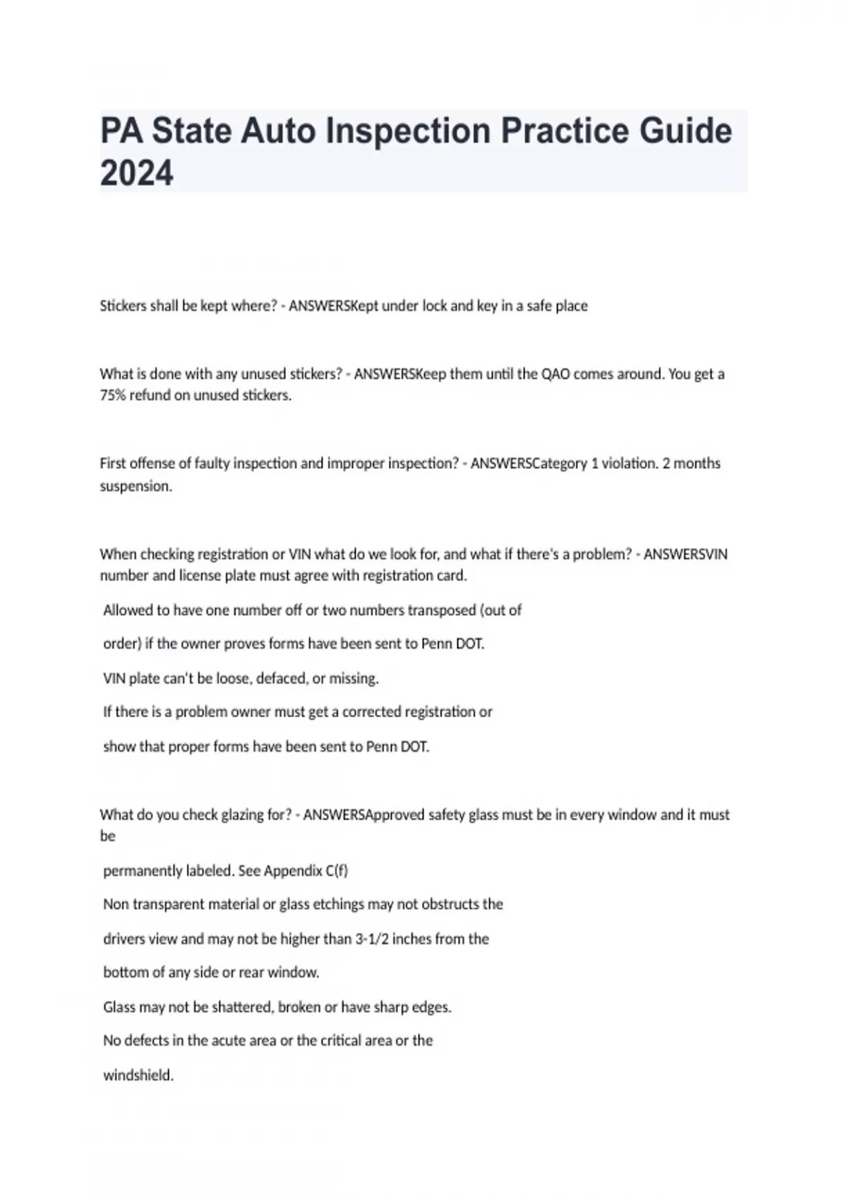 Exam (elaborations) PA state inspection categories test Accurate Answers 2024 2 Exam (elaborations) PA State Inspection Proctored exam 2024 3 Exam (elaborations) PA Safety inspection Review Revision 2024 4 Exam (elaborations) Pa Safety Inspection Practice Questions 2024 5 Exam (elaborations) PA State Inspection Mechanic Practice Test Study Guid