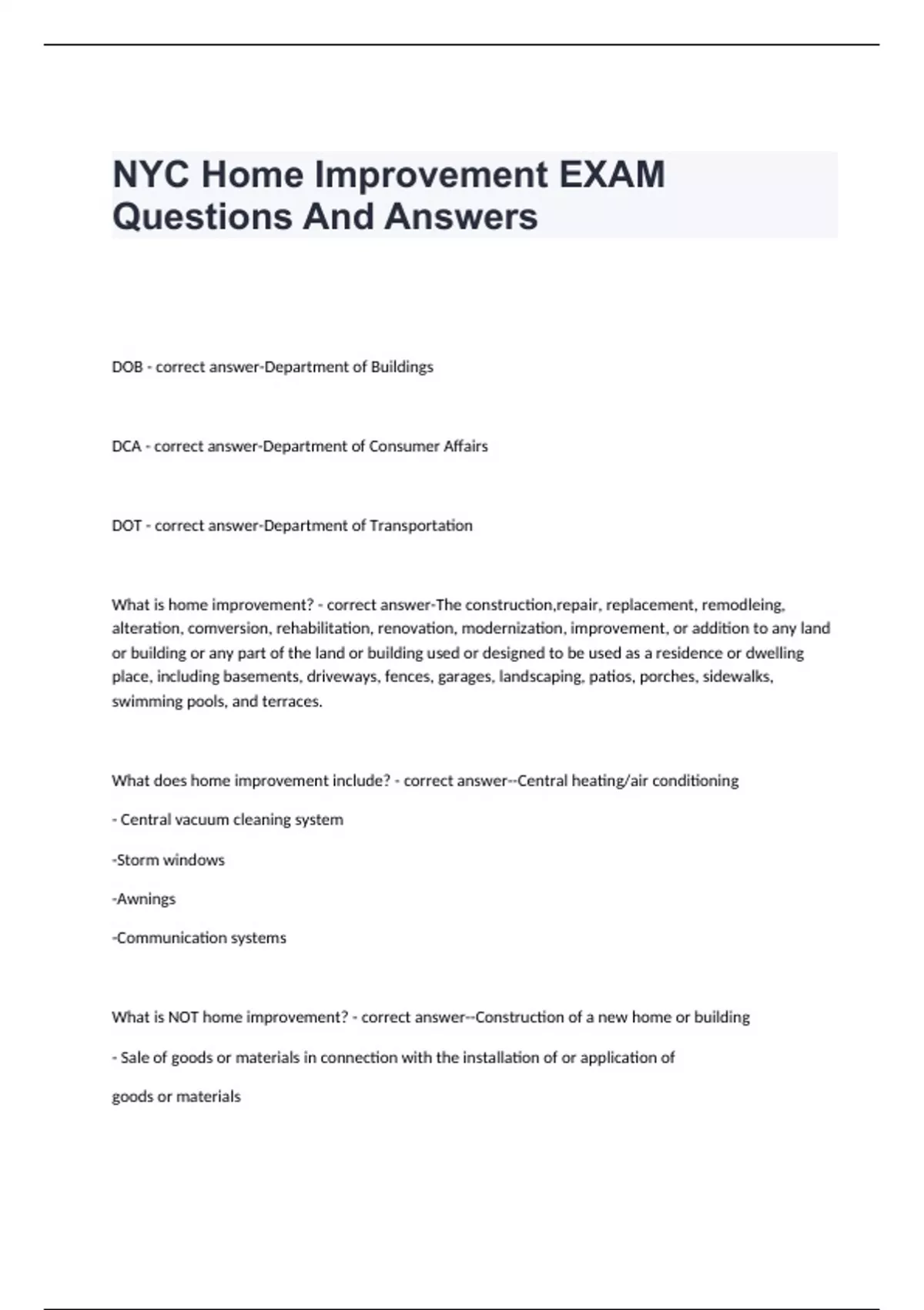 NYC Home Improvement EXAM Questions And Answers