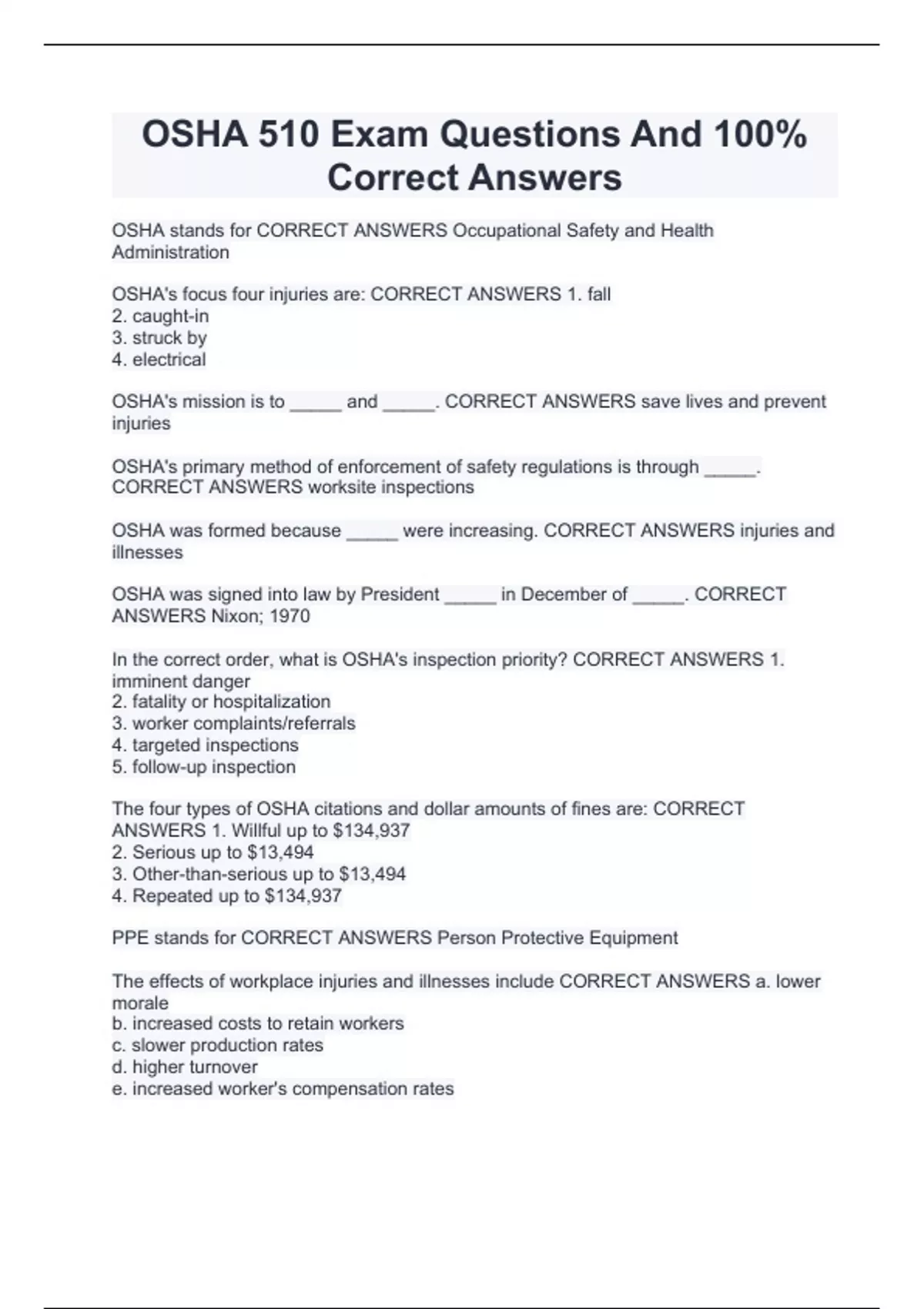 OSHA 510 Exam Questions And 100% Correct Answers OSHA 510 Test Questions With Complete Solutions | Verified OSHA 510 Practice Exam With Complete Solutions OSHA 510 study guide with 100% correct answers | guaranteed success