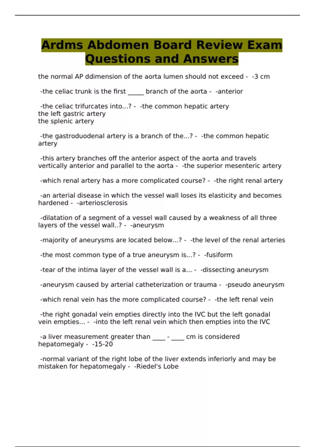 Ardms Abdomen Board Review Exam Questions and Answers