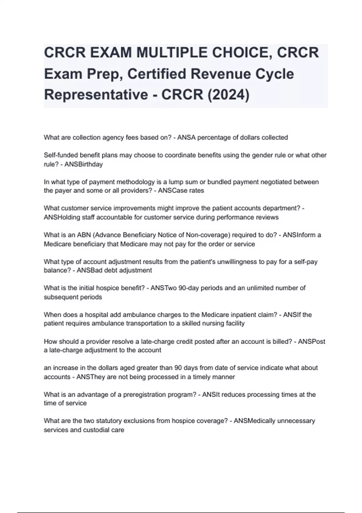 HFMA CRCR EXAM LATEST EXAM 2024/2025 QUESTIONS AND CORRECT ANSWERS( 100%VERIFIED ANSWERS)ALL BUNDLED HERE!!!