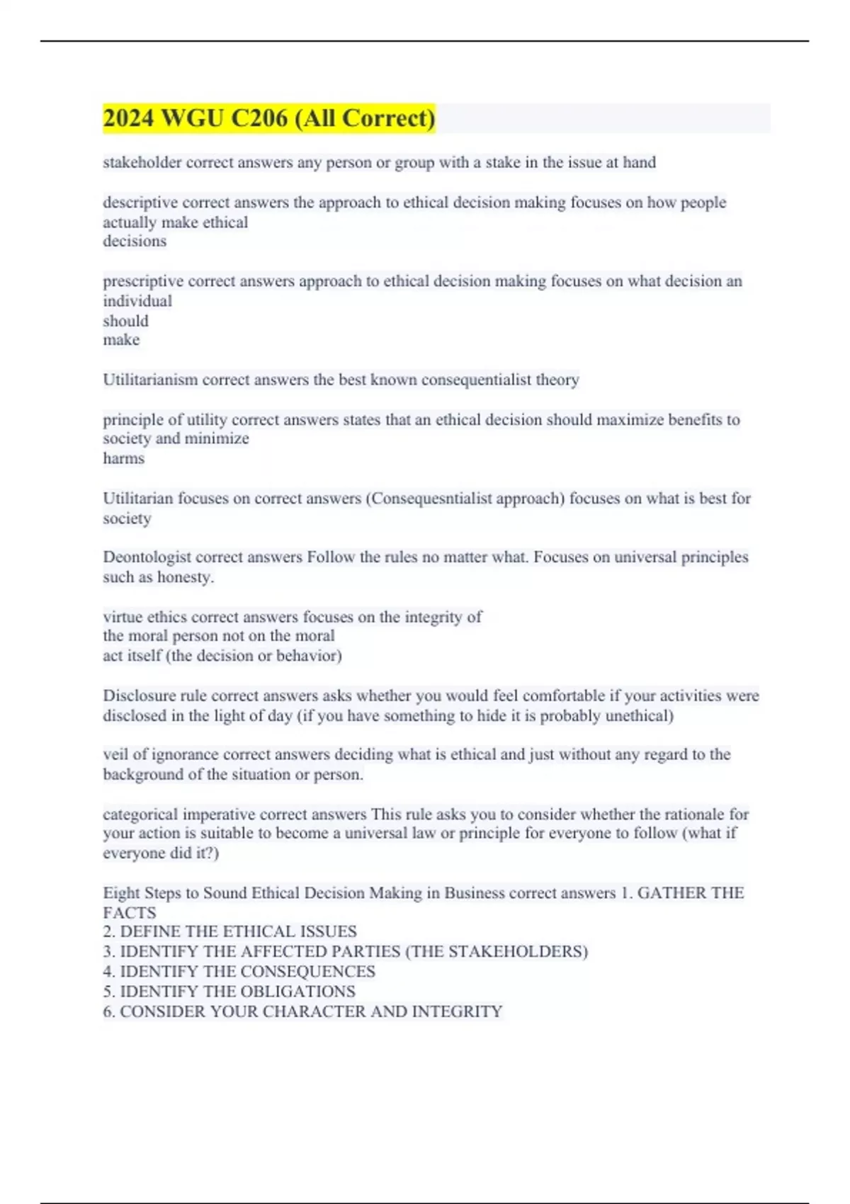 2024 WGU C206 (All Correct) WGU Ethical Leadership - C206 (2024) A+ Guaranteed. WGU C206 Ethical Leadership Chapter 1, WGU C206 Ethical Leadership Chapter 2, WGU C206 Ethical Leadership Chapter 3, WGU C206 Ethical Leadership Chapter 4, WGU C206 Ethical Leadership Chapter 5, WGU C206 Ethical Leadership Chapter 6 (All needed to pass) WGU C206 ELI (Al
