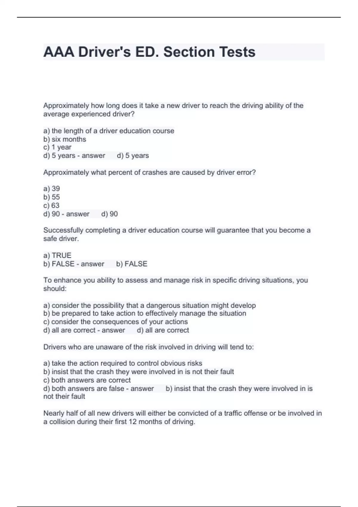 Exam (elaborations) AAA driving questions and Answers 2024 Exam (elaborations) Drivers Ed AAA Test Review Questions and Answers 2024 Exam (elaborations) AAA Driver's Course____ out Questions and Answers 2024 Exam (elaborations) AAA Drivers Hell - getting ready to drive Questions and Answers Rated A+ Exam (elaborations) AAA Driver's Hell -