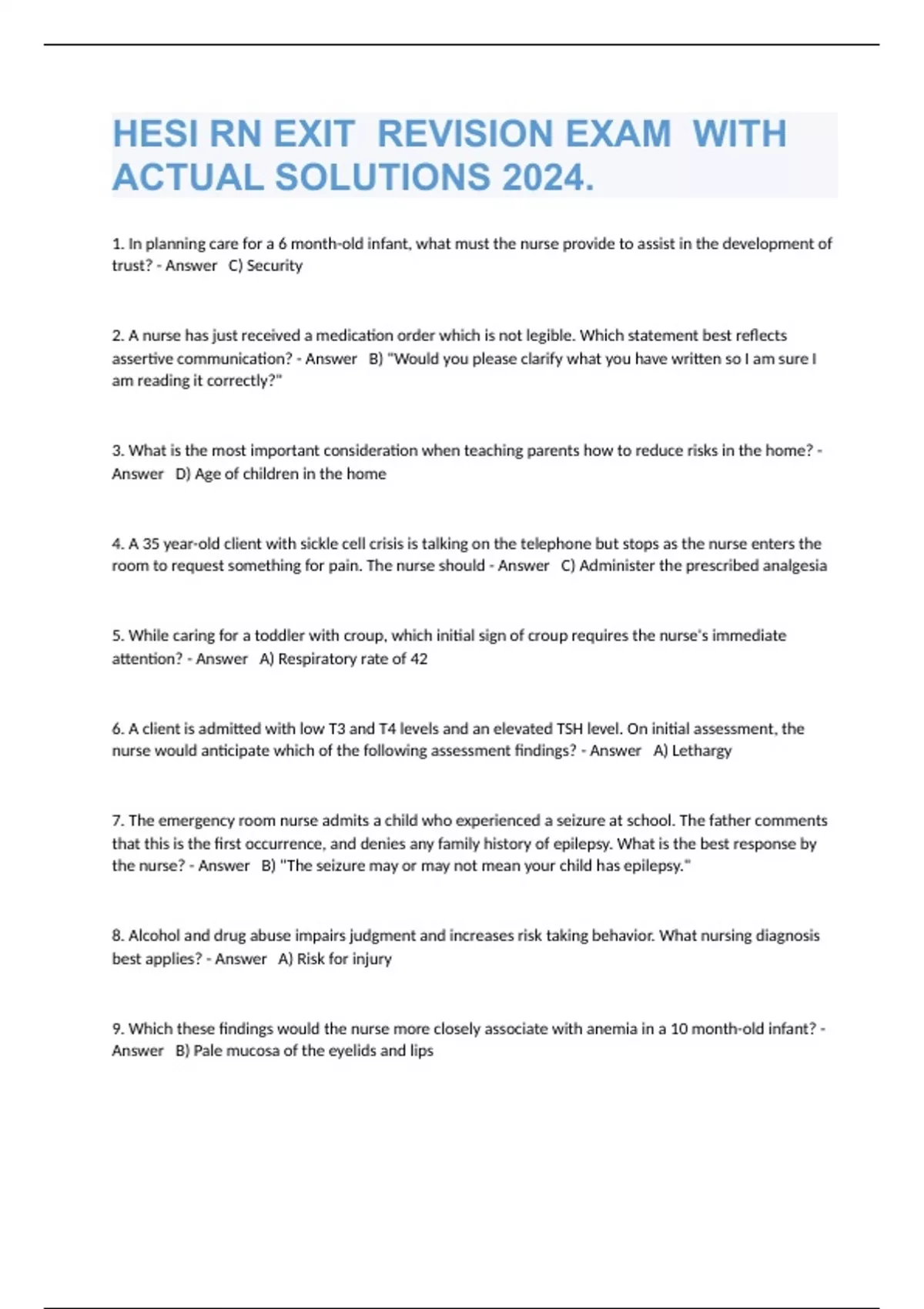 1 Exam (elaborations) HESI Exit Practice Questions and Rationale Exam And Correct Answers 2024. 2 Exam (elaborations) HESI RN Exit Exam License Exam With All Correct Answers 2024. 3 Exam (elaborations) HESI Exit - Leadership & Management Prep Exam Well Answered Rated A+ 2024. 4 Exam (elaborations) RN Exit Hesi Revision Exam With Actual Answers 2