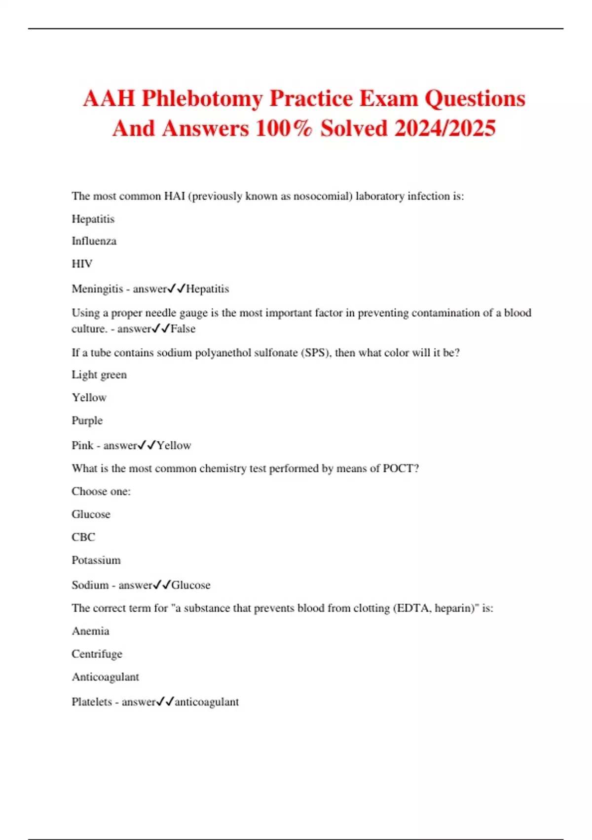 AAH Phlebotomy Practice Exam Questions And Answers 100% Solved 2024/2025