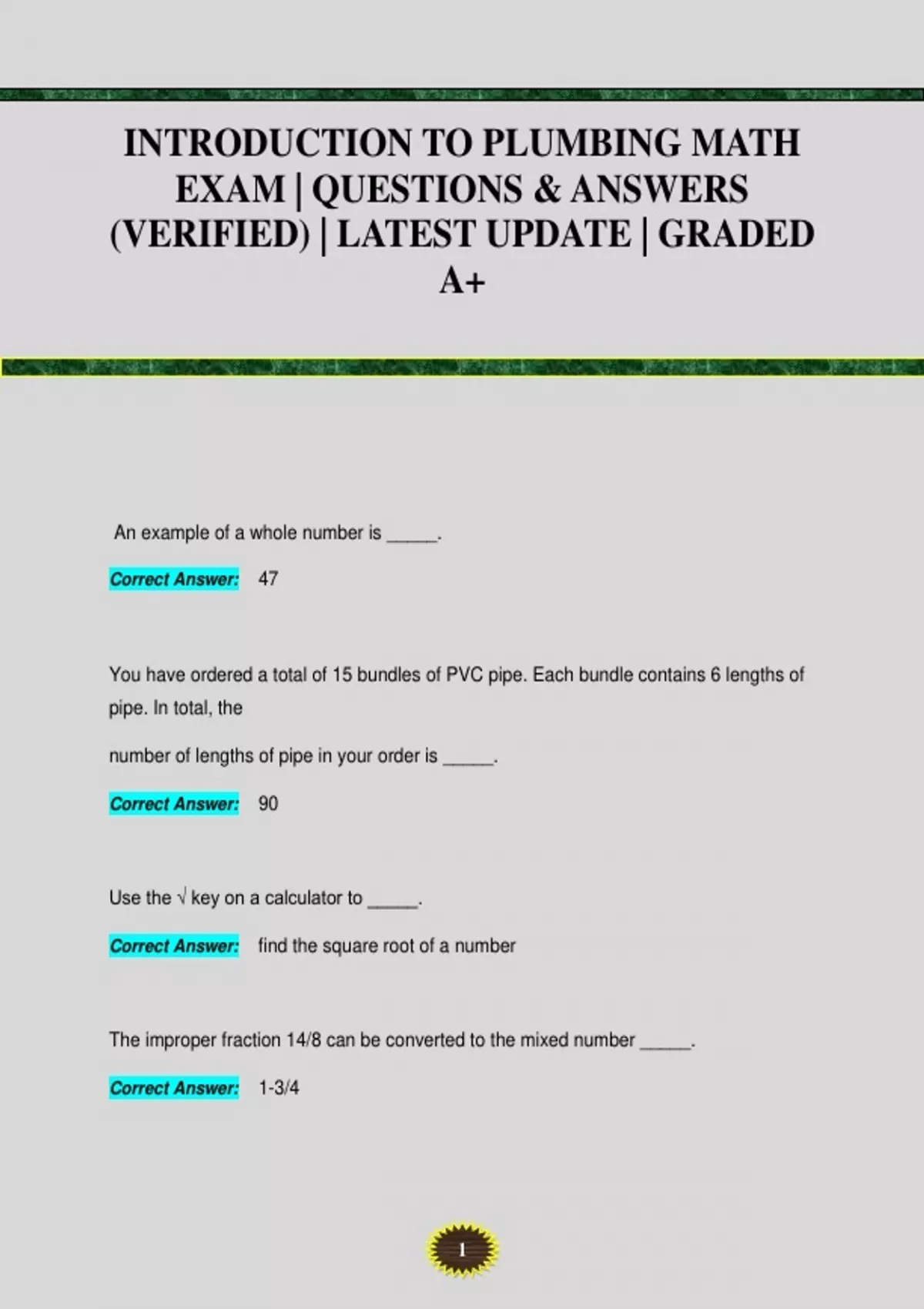 INTRODUCTION TO PLUMBING MATH EXAM | QUESTIONS & ANSWERS (VERIFIED) | LATEST UPDATE | GRADED A+