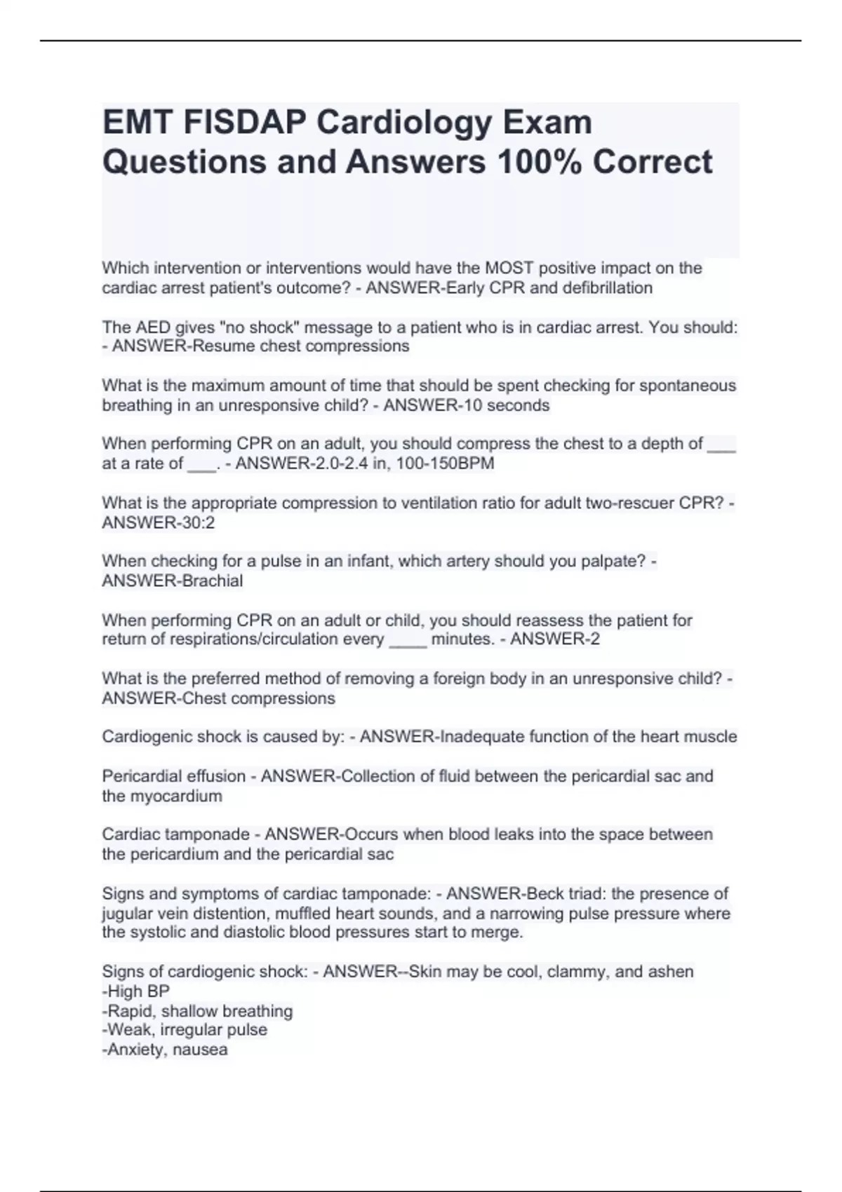 EMT FISDAP Cardiology Exam Questions and Answers 100% Correct