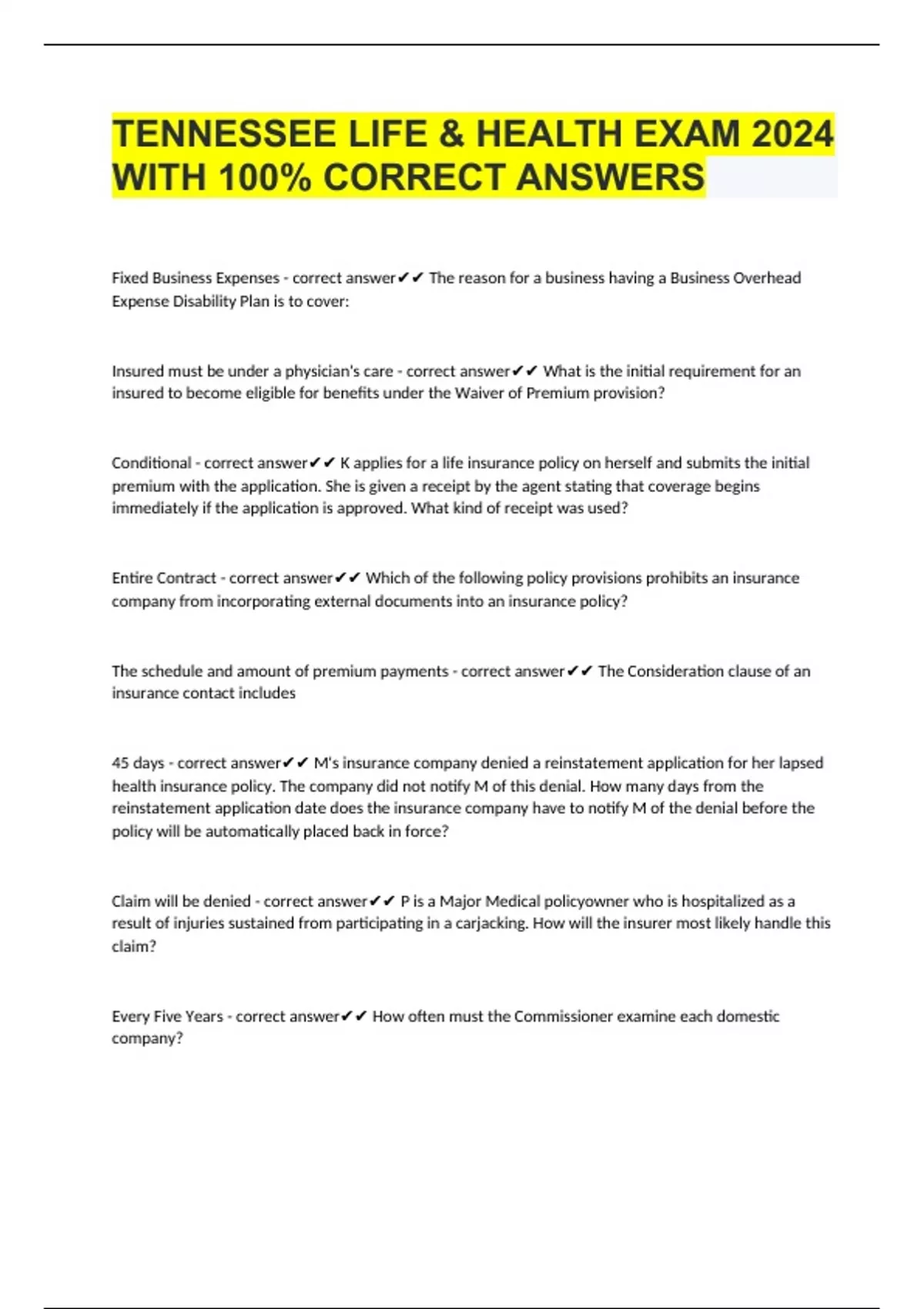 TENNESSEE LIFE INSURANCE TEST EXAM 2024 WITH 100% CORRECT ANSWERS Tennessee Life Insurance exam 2024 with 100% correct answers