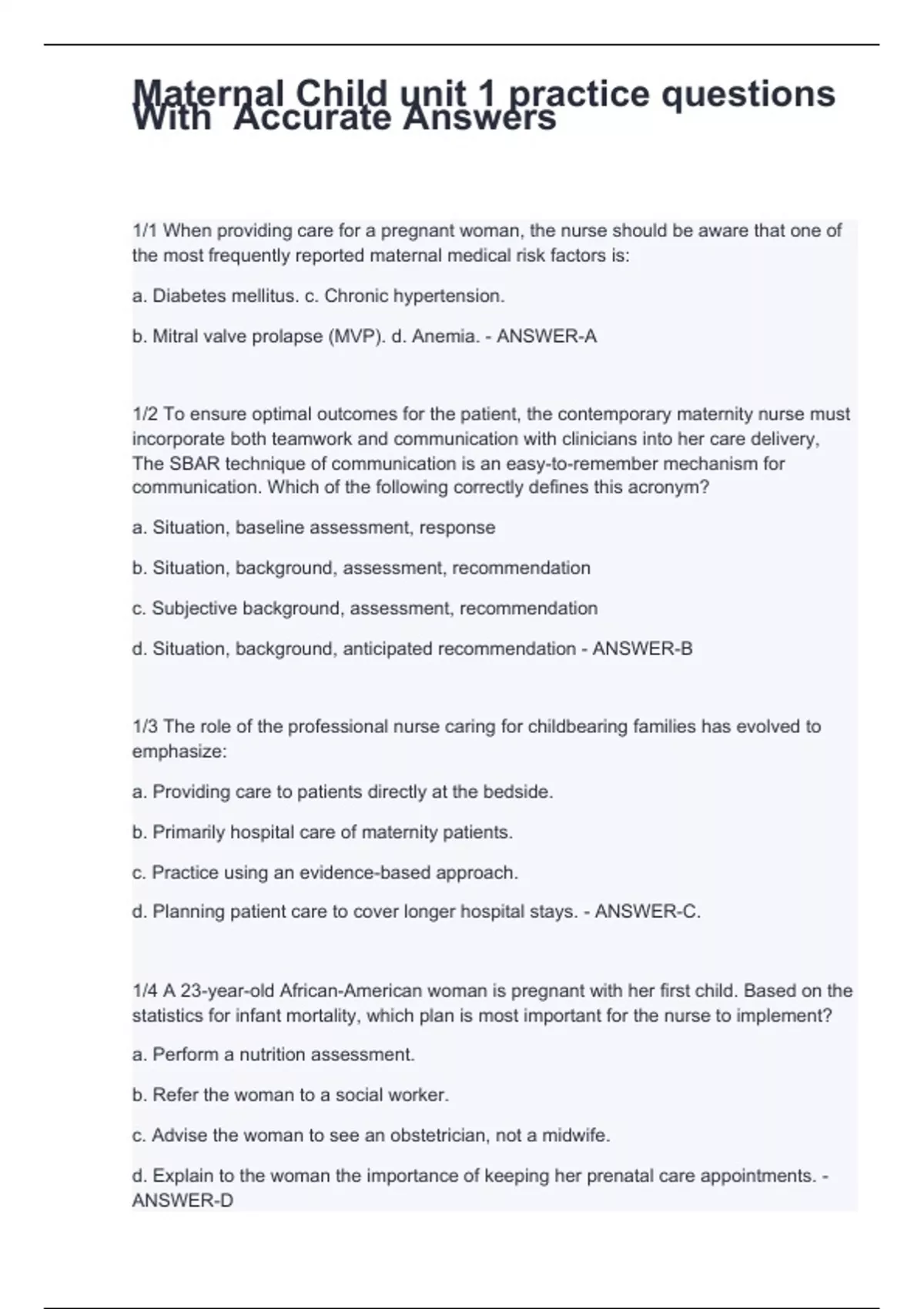 Maternal Child Nursing Exam 1 Questions and Answers(RATED A)