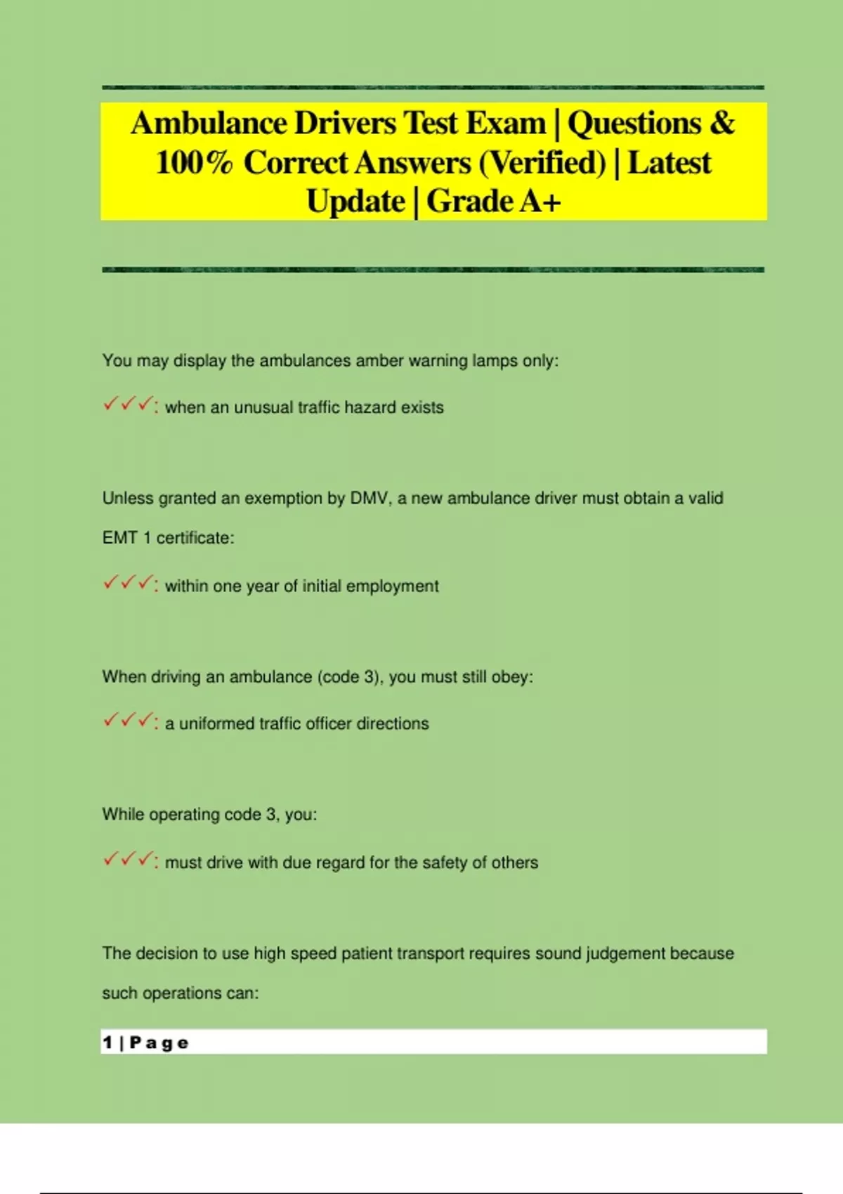 Ambulance Driver test Exams pack | Questions & 100% Correct Answers (Verified) | Latest Update | Grade A+