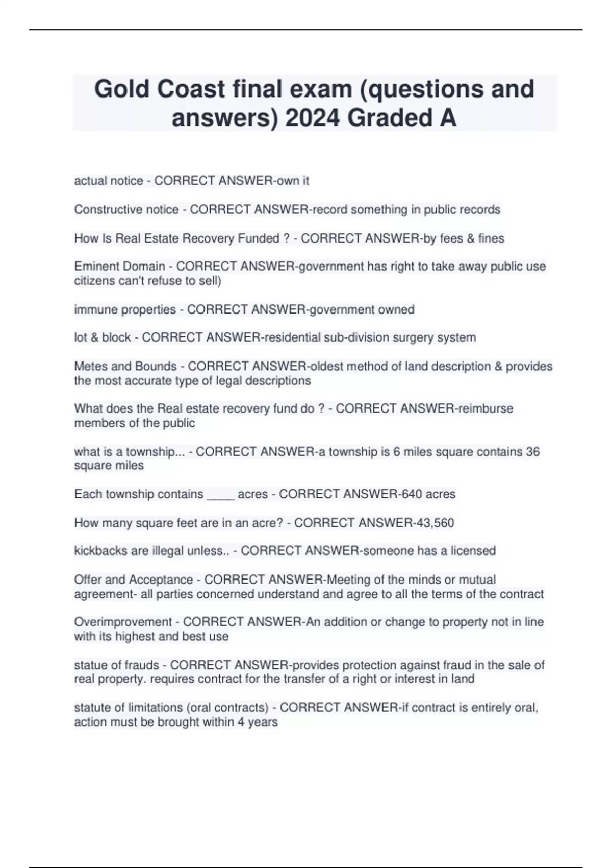 Gold Coast final exam (questions and answers) 2024 Graded A Gold Coast Final Exam Study Set 2024 Gold Coast Final Exam Study Guide 2024 Questions with Verified Answers Gold Coast Real Estate Final Exam 2024 Gold Coast Exam Questions & Answers (exam 2024) Gold Coast School Real Estate Questions Ch.1-19 2024 Updated Gold Coast RE 1001 Cram, Practice