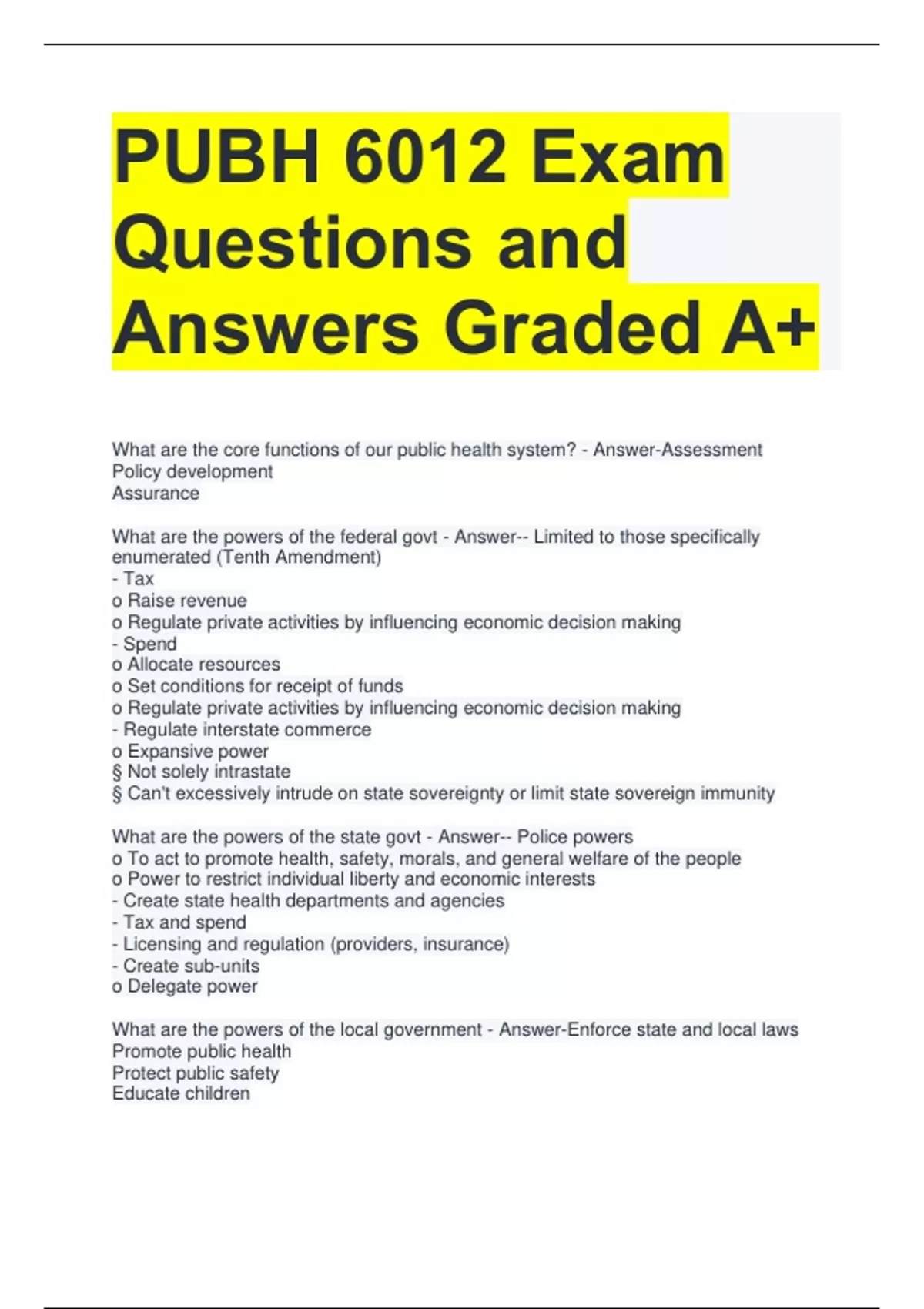 PUBH 6012 Exam 1 Questions and Answers 2024 Exam Graded A+ 2 Exam (elaborations) PUBH 6012 Exam 1 Study Guide Questions with A Grade Solutions 3 Exam (elaborations) PUBH 6012 Exam 2 with All Correct Answers 4 Exam (elaborations) PUBH 6012 Exam 3 Questions and Answers All Correct 5 Exam (elaborations) PUBH 6012 Exam 2 Questions with Answers All