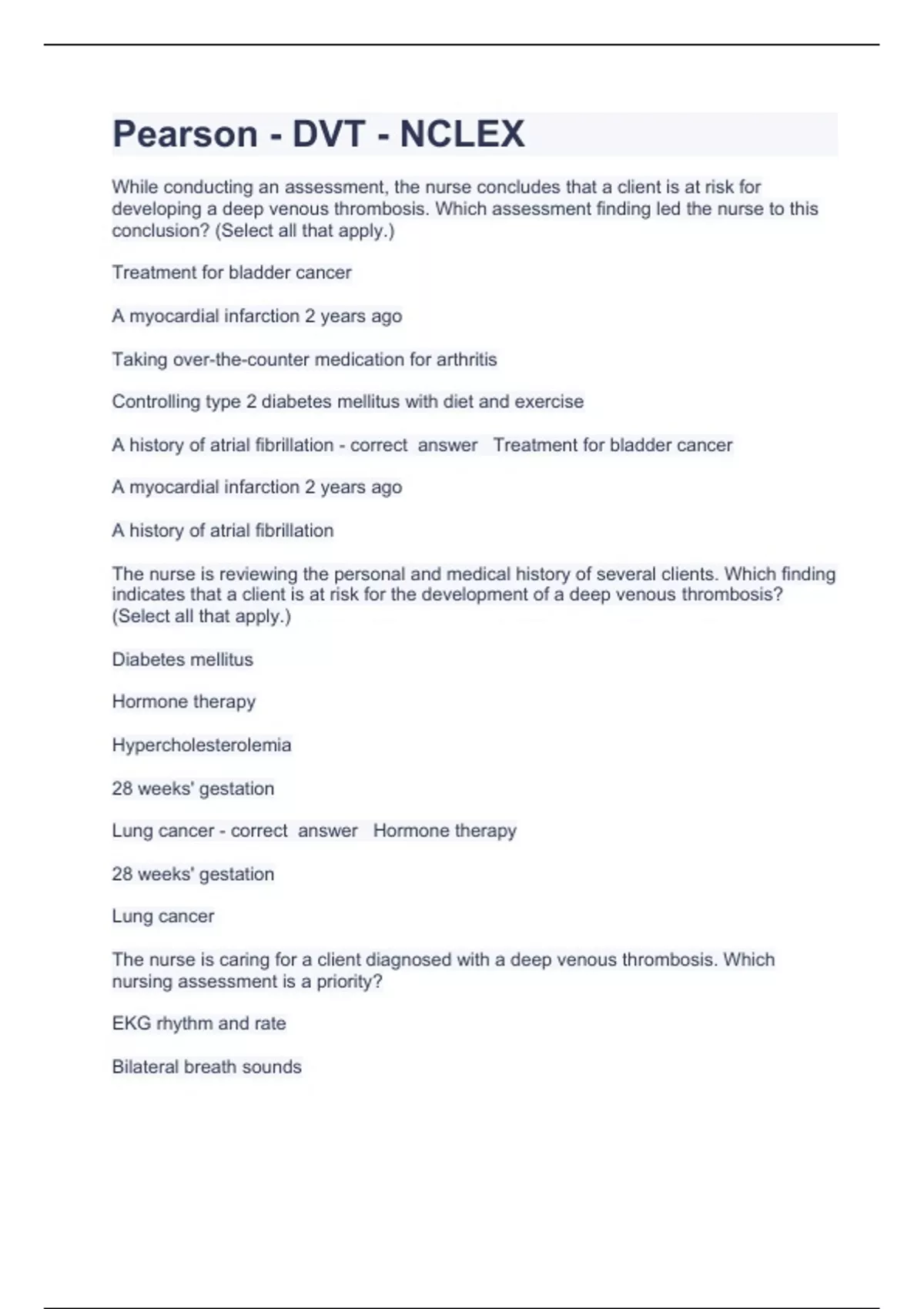 Exam (elaborations) AH3 Question and answers correctly solved 2024 Exam (elaborations) Deep Vein Thrombosis med surg questions and answers 2024 verified to pass Exam (elaborations) Deep Vein Thrombosis Question and answers already passed 2024 Exam (elaborations) DVT mylab nclex questions 16 Question and answers 100% correct 2024 Exam (elabo