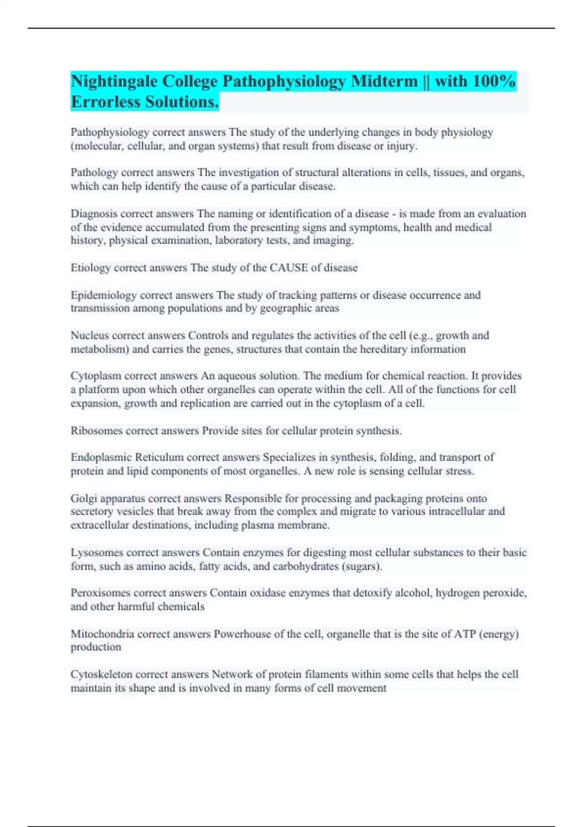 SCI225 Pathophysiology weeks 4-6 quiz || with 100% Correct Answers. Nightingale College Pathophysiology Midterm || with 100% Errorless Solutions. Nightingale Pathophysiology final || Questions and 100% Accurate Answers. NURS 220 Patho I Final || All Answers Are Correct 100%. NURS 225 Stroke Pathophysiology EXAM 3 || with 100% Error-free Solutions.