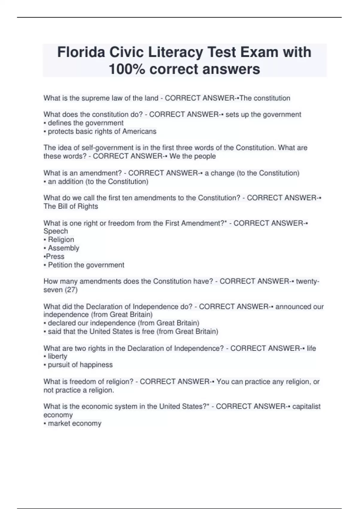 Florida Civic Literacy Exam Study Guide updated questions and answers Florida Civic Literacy Test Exam with 100% correct answers Study guide for Florida Civics Literacy exam (latest verified answers) Civic Literacy Florida Review exam actual questions and answers Civic Literacy Florida final exam test (questions and solutions) Florida Civic Literac