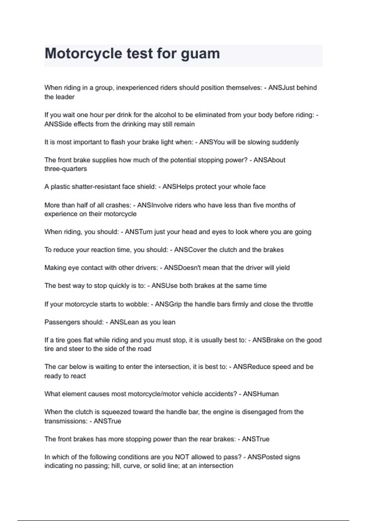 Motorcycle test for Guam QUESTIONS WITH COMPLETE 100% VERIFIED SOLUTIONS 2024/2025 (ALL BUNDLED HERE!!!)