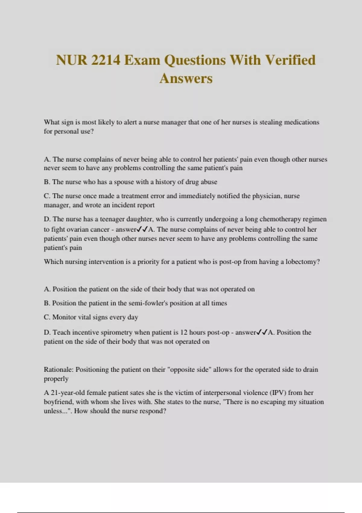 NUR 2214 Exam Questions With Verified Answers