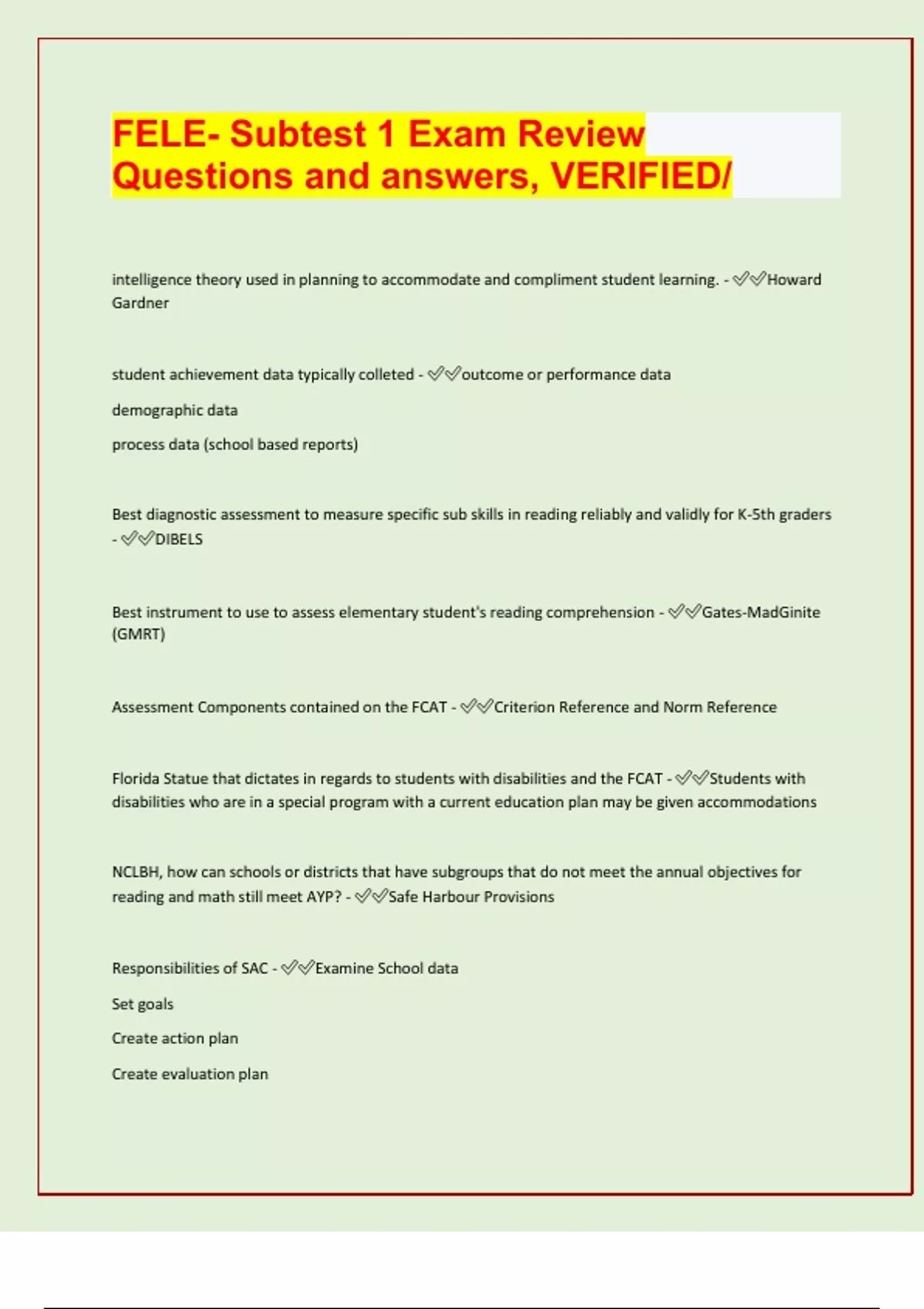 FELE Sub Test 1 Review Questions and answers, verified/| LATEST EXAM PREDICTIONS 2024