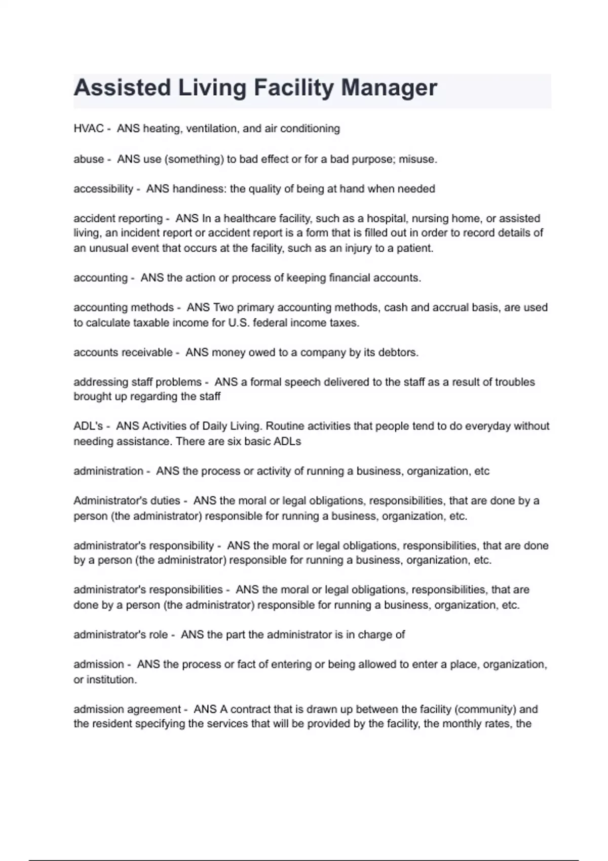 Assisted Living Facility Manager Exam Questions and Answers 2024( A+ GRADED 100% VERIFIED).
