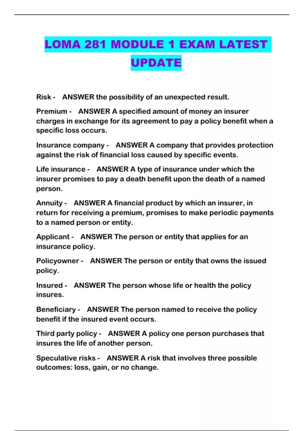 LOMA 281 MODULE 1 EXAM LATEST UPDATE