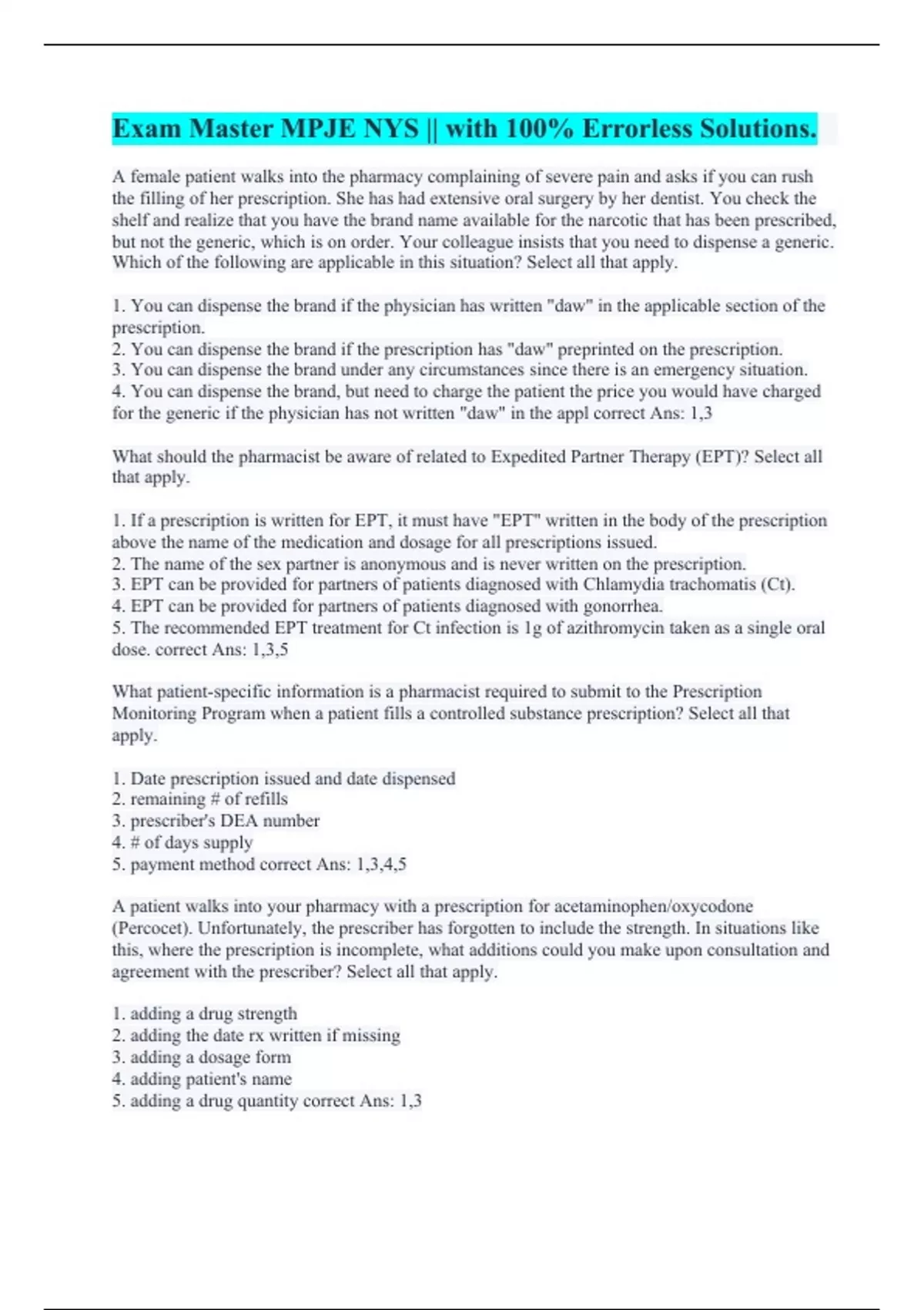 Exam Master MPJE NYS || with 100% Errorless Solutions. Prontopass NYS MPJE Questions || with 100% Error-free Answers. Pharmacy Law || Already Graded A+. Pharmacy Law - New York MPJE || with 100% Errorless Answers. Pharmacy Law - MPJE NYS || with 100% Correct Answers. Part IV: State of New York Pharmacy Law and Rules || with Error-free Solutions. Pa