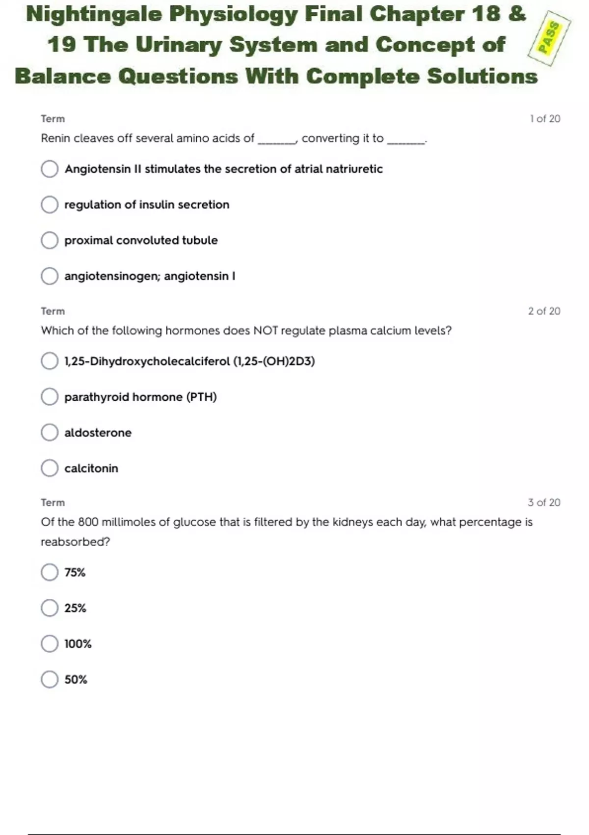 NIGHTINGALE PHYSIOLOGY FINAL CHAPTER 18 & 19 THE URINARY SYSTEM AND CONCEPT OF BALANCE EXAM WITH COMPLETE SOLUTIONS