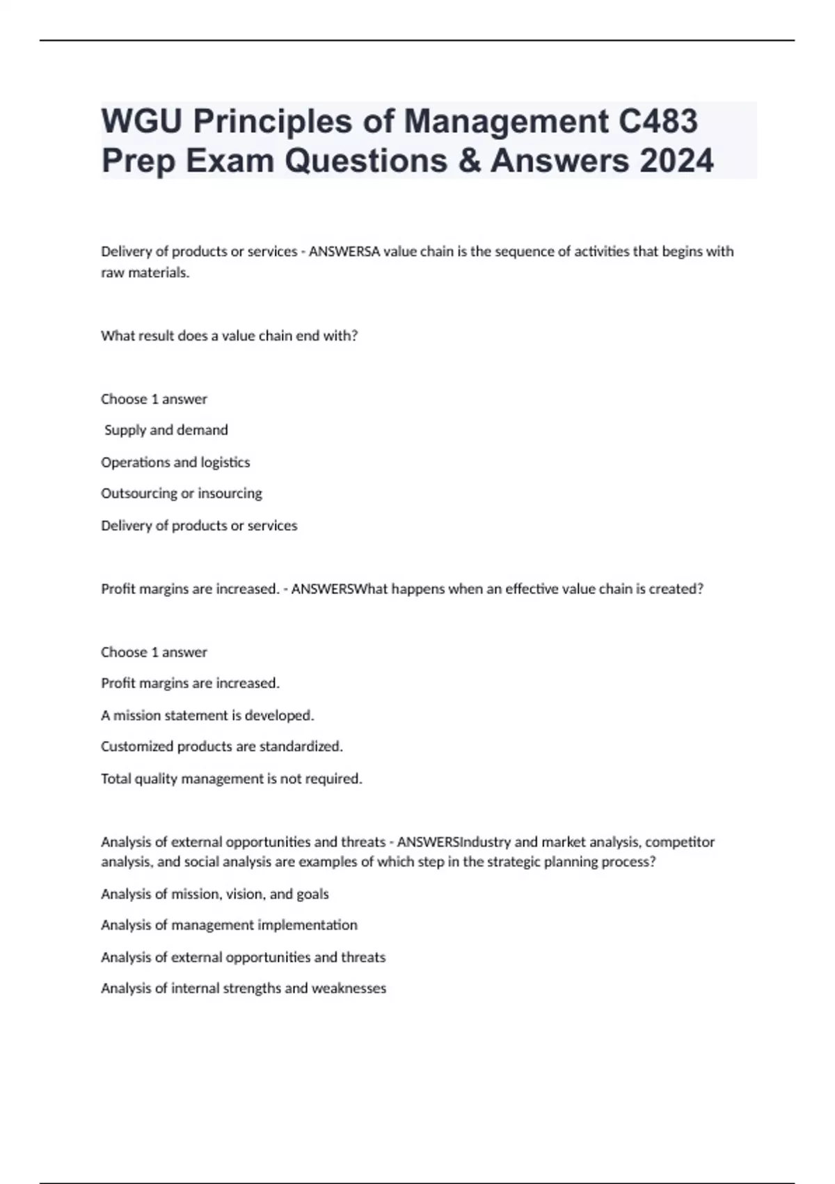 WGU Principles of Management C483 Prep Exam Questions & Answers 2024