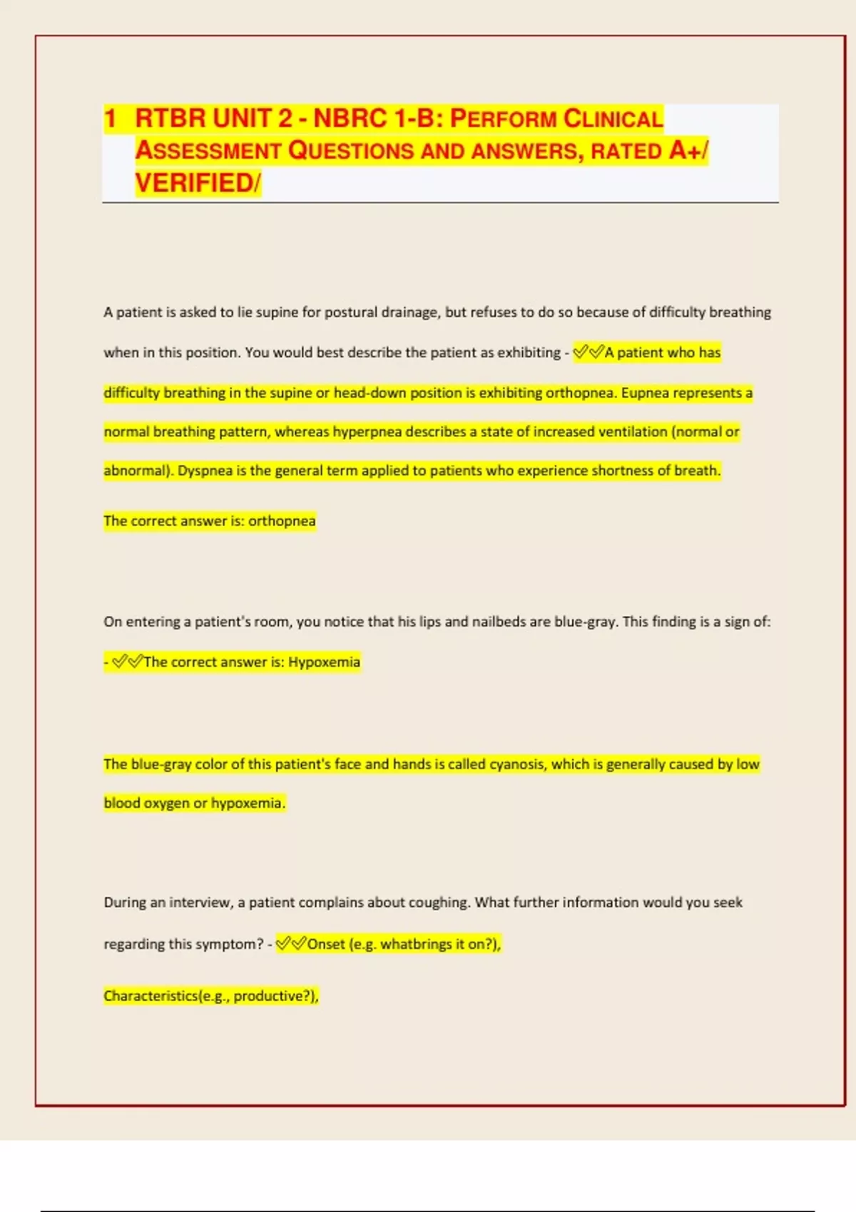 RTBR UNIT 2 - NBRC 1-B: PERFORM CLINICAL ASSESSMENT QUESTIONS AND ANSWERS, RATED A+/ VERIFIED/