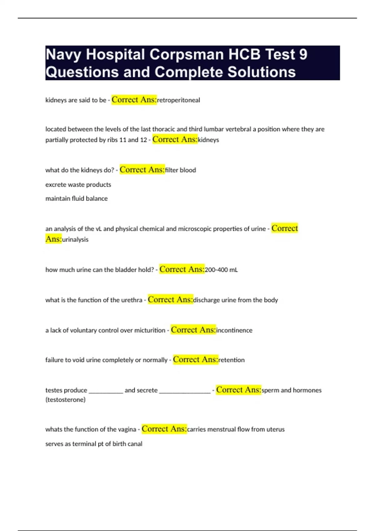 Navy Hospital Corpsman HCB Test 9 Questions and Complete Solutions.