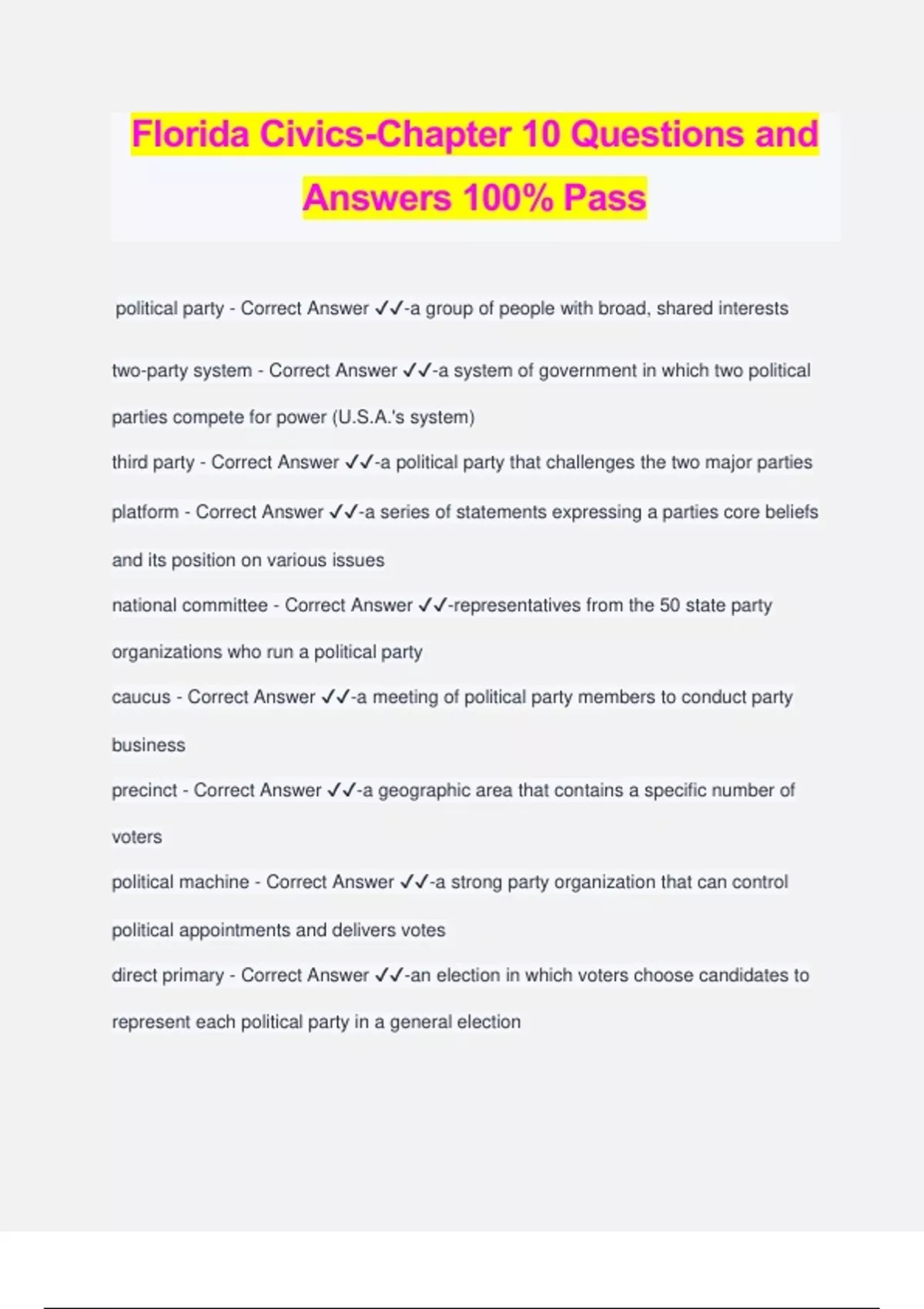 Florida Civic Literacy Bundled Exams Questions and Answers 100% Verified and Updated | Graded A+