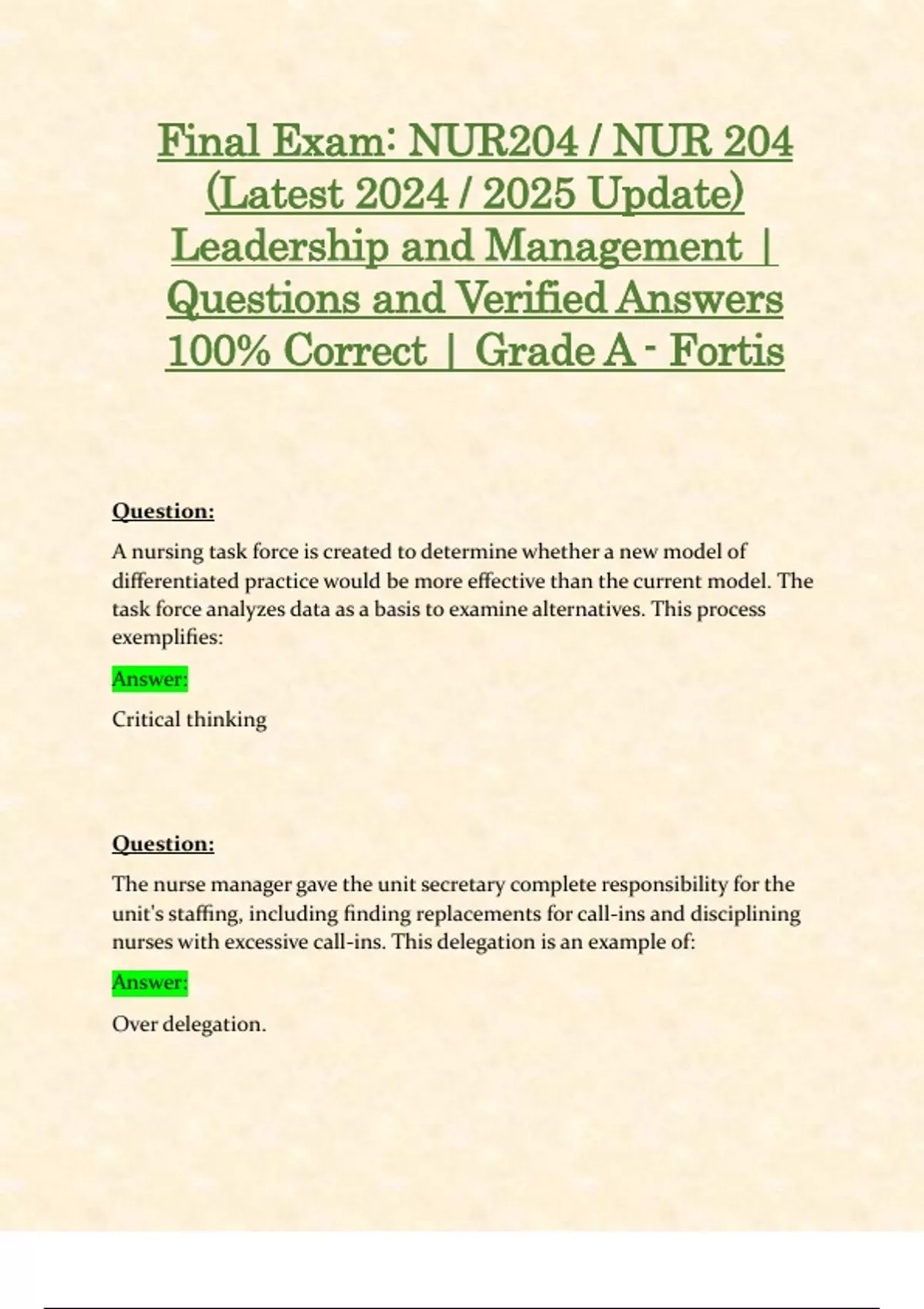 Final Exam & HESI: NUR204 / NUR 204 (Latest 2024 / 2025 Updates STUDY BUNDLE WITH COMPLETE SOLUTIONS) Leadership and Management | Questions and Verified Answers | 100% Correct | Grade A – Fortis
