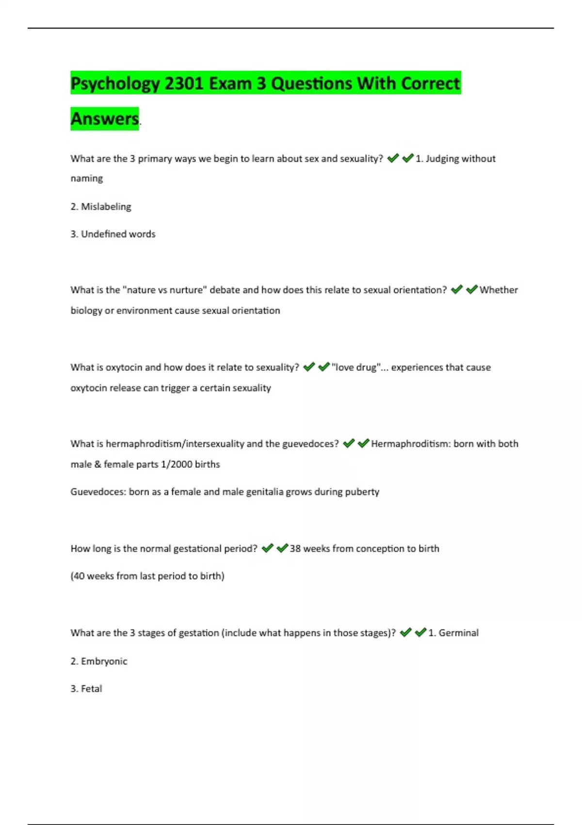 Exam (elaborations) General Psychology 2301 Chapter 1 Questions With 100% Correct Answers!! 2 Exam (elaborations) General Psychology 2301 Exam 1 questions and answers all are correct 2024 graded A+ 3 Exam (elaborations) General Psychology 2301 Exam #2 Cognitive & Developmental Psychology Questions With Correct Answers. 4 Exam (elaborations) Psyc