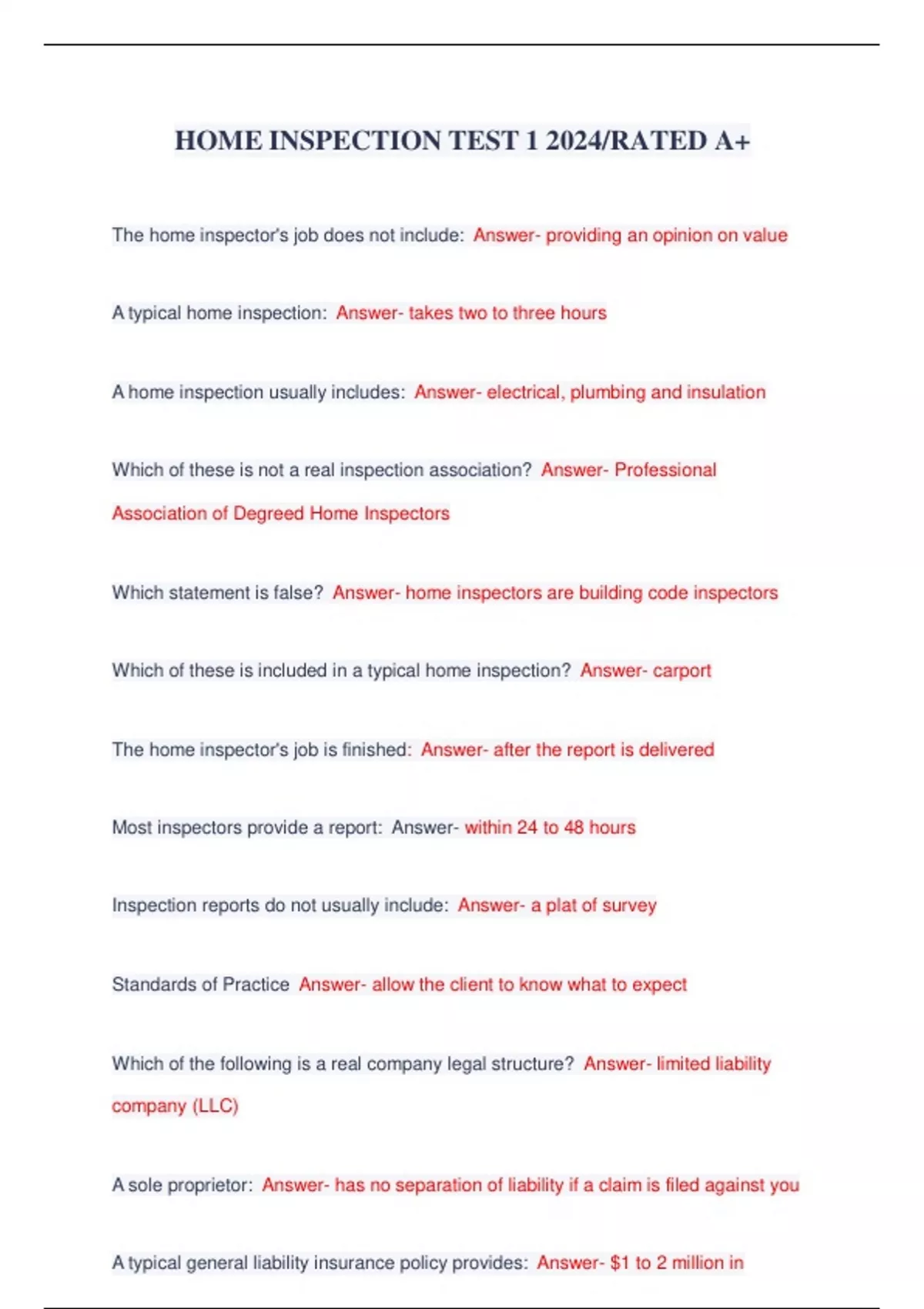 PACKAGE VALUE PACK FOR HOME INSPECTION EXAM 2024|QUESTIONS WITH 100% CORRECT ANSWERS| A+ GRADED